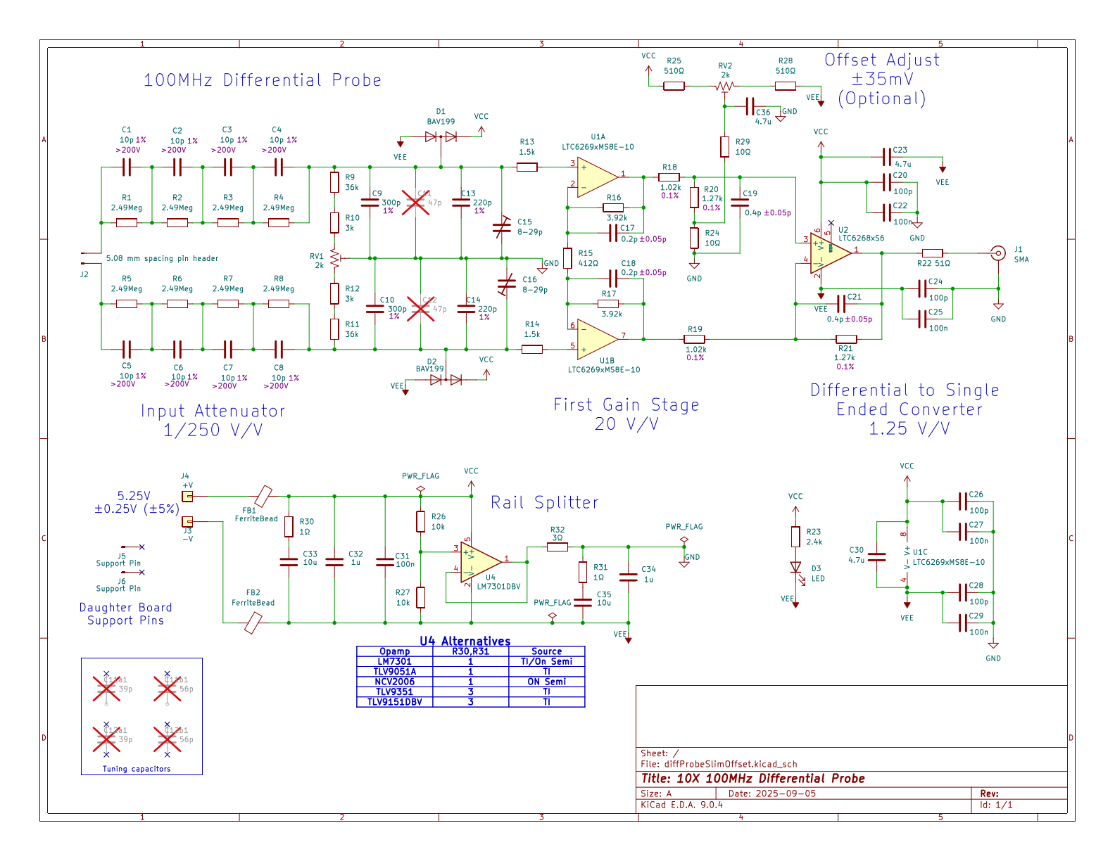 - Offset adjustment. Up to 35mV of adjustment to the output voltage of the probe. This is not without some degradation in performance — both gain accuracy and supply rejection, along with other untoward negativities. But it is optional if you decide it is not worth it.