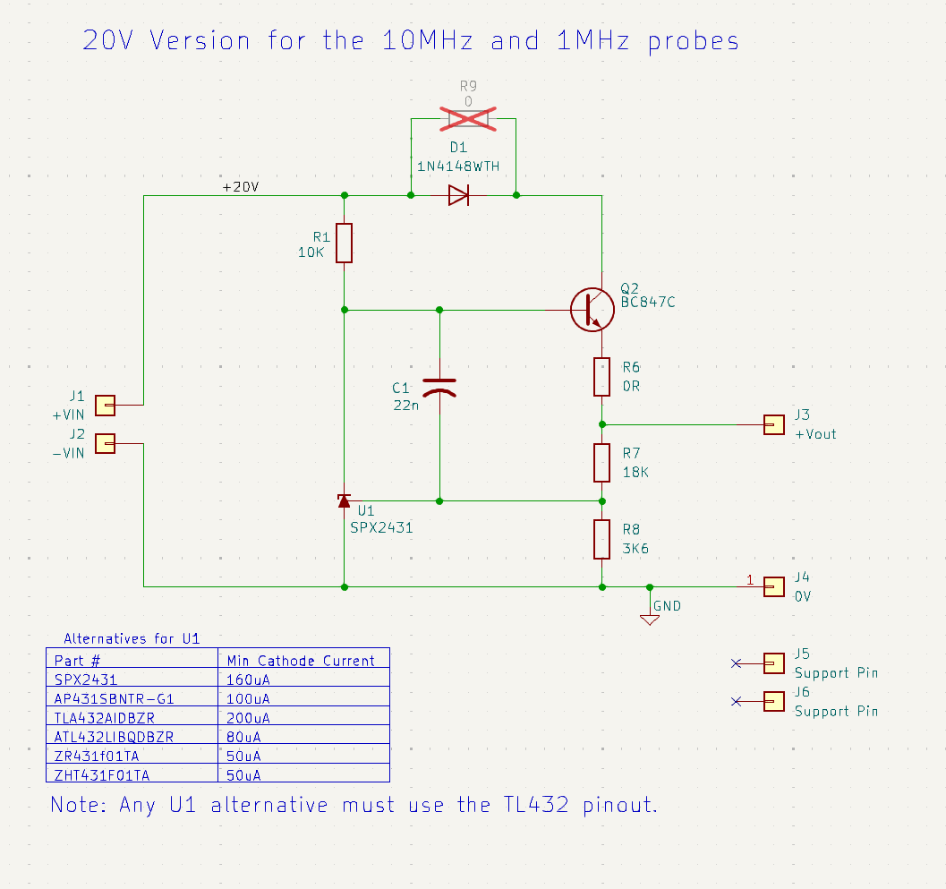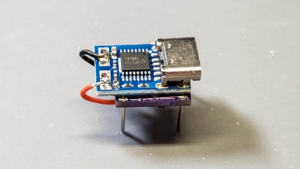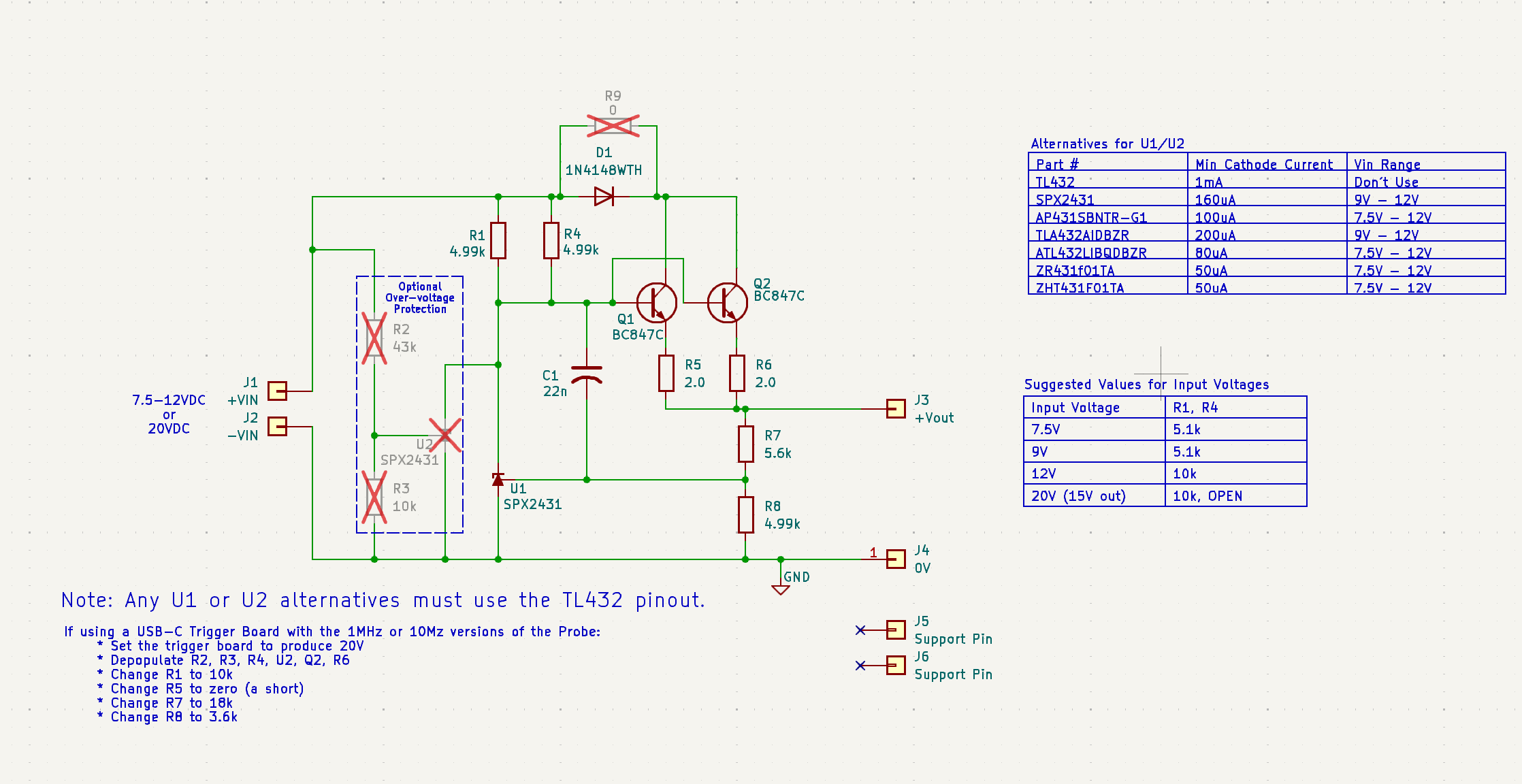 - Modular. The previous design had two incarnations — mine and Paul’s. Mine was powered by an isolated 5V wall adapter. Paul’s power was a 7.5V-12V wall adapter, which required an on-board voltage regulator on the probe. This new probe uses a basic core probe that requires 5VDC, or 15VDC isolated power, but it can be configured to accept various USB connectors and voltage ranges through the use of separate daughter boards that plug into the rear of the probe’s core PCB. Right now there are 5 daughter boards: a standard micro USB-B 5V interface, three voltage regulators that will take 7.5V-12V (bare wires) as an input and deliver 5.3VDC to the probe, and a USB-C trigger board that provides 9V or 12V to the voltage regulator daughter board. Something for everybody. The daughter boards are small, and therefore relatively cheap, made with easy to get ubiquitous components. Beware, the reverse polarity protection has been removed.