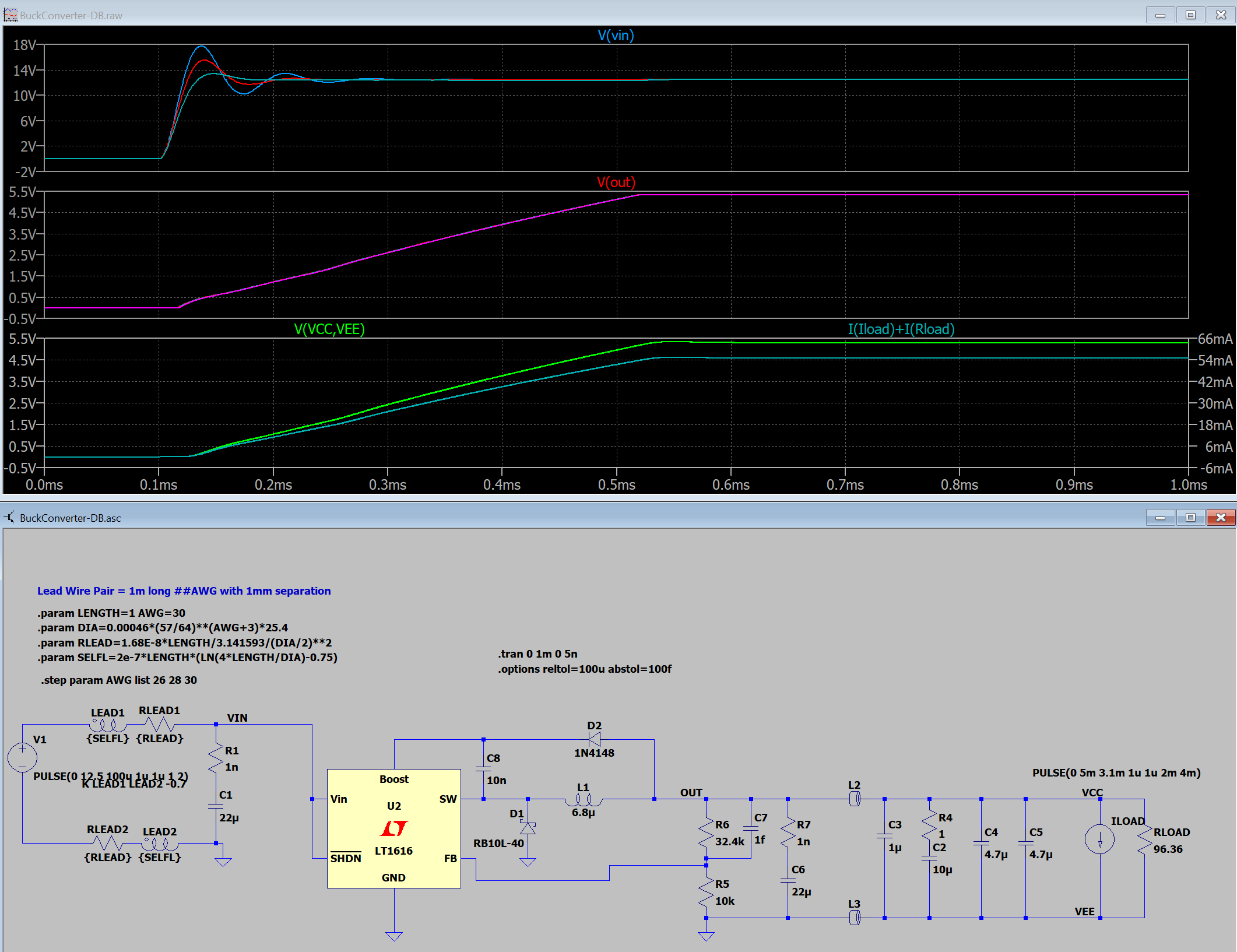I put the lead inductance model in series with the buck converter input and checked in over various simulation parameters. There is one interesting phenomenon that show up: if you connect a powered adapter to the daughter board there's a chance that you can damage the daughter board. Here's one case where having cheap 30AWG leads from the adapter can save you. I ran a simulation of this event using 26-30AWG lead wires. Here is the result (without a snubber at the input):