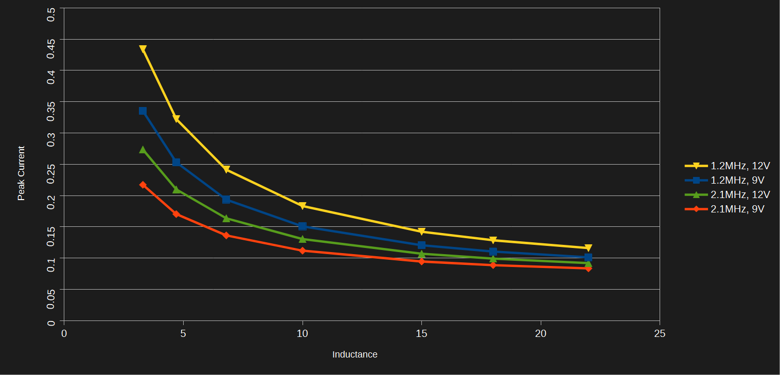 I put question marks in columns where I could not determine the best component value to match the IC. Some data sheets provide a range of inductor values (or even suggested part numbers). Others simply indicate a maximum inductor value for a specific output voltage. And others provide a vague suggestion about larger inductors being better for lower current loads. Having designed these types of switching converters in a previous life, I have thoughts about that. There is a comparator that senses the inductor current and decides when to turn off the switch. If the ripple current is too low, because the inductor value is too large, the comparator might not be able to make the proper decision and a problem ensues.