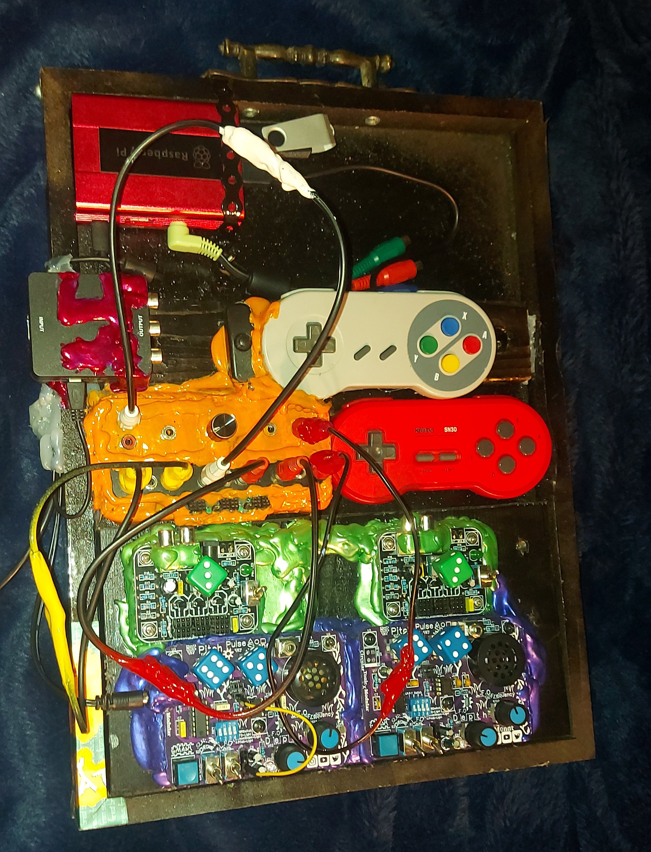 Printed Circuit Boards made with slimy Toxic theme. I have Been messing around with AV gear a little bit. This is a combined effort to dive a little bit into AV modulation with some of the extra Circuits. It is on a Wooden frame board and can be swapped out with other setups. I think it is a good way to use up some of the Extra more borked PCBS that require extra modification. But are still very useful.