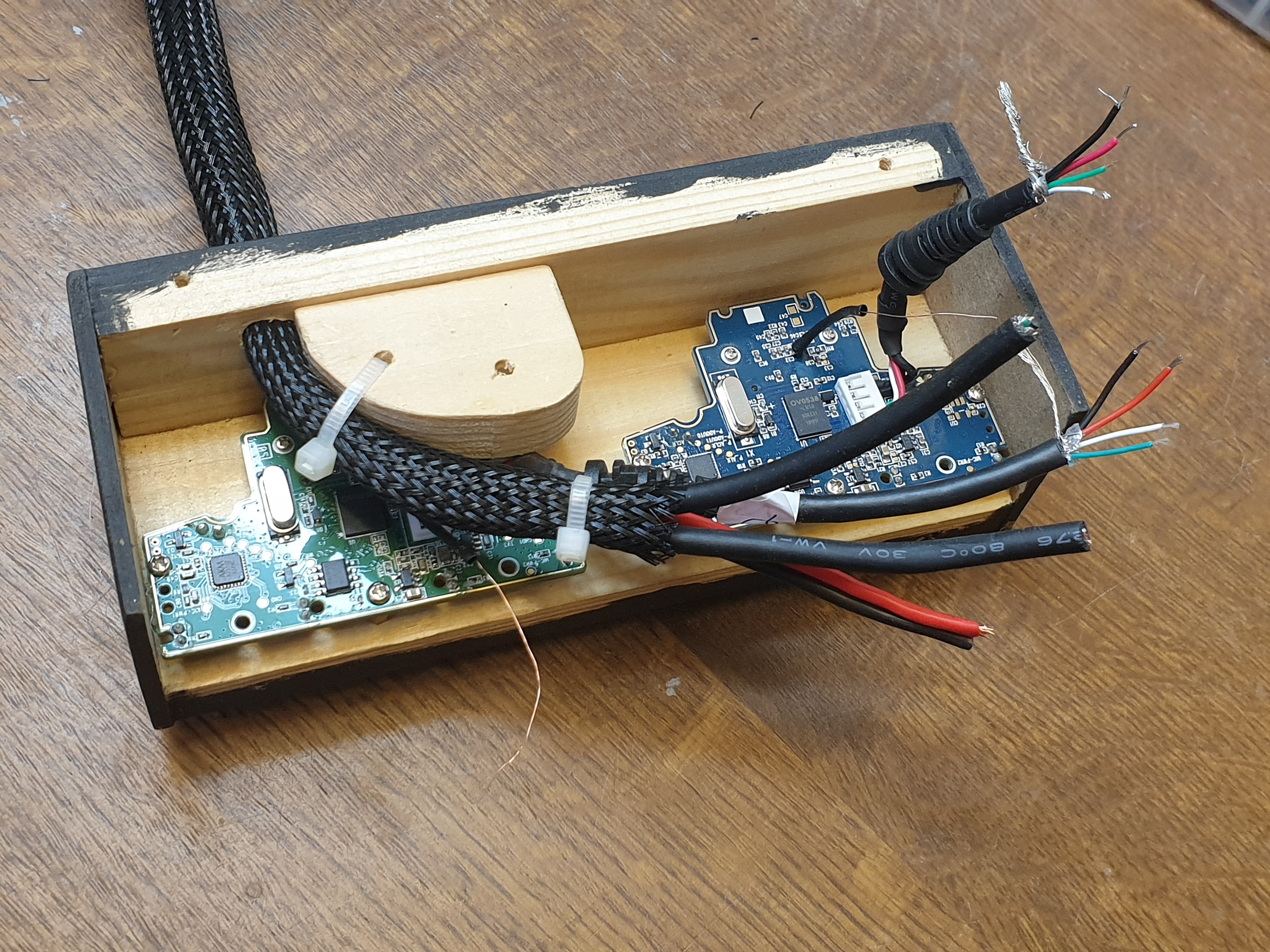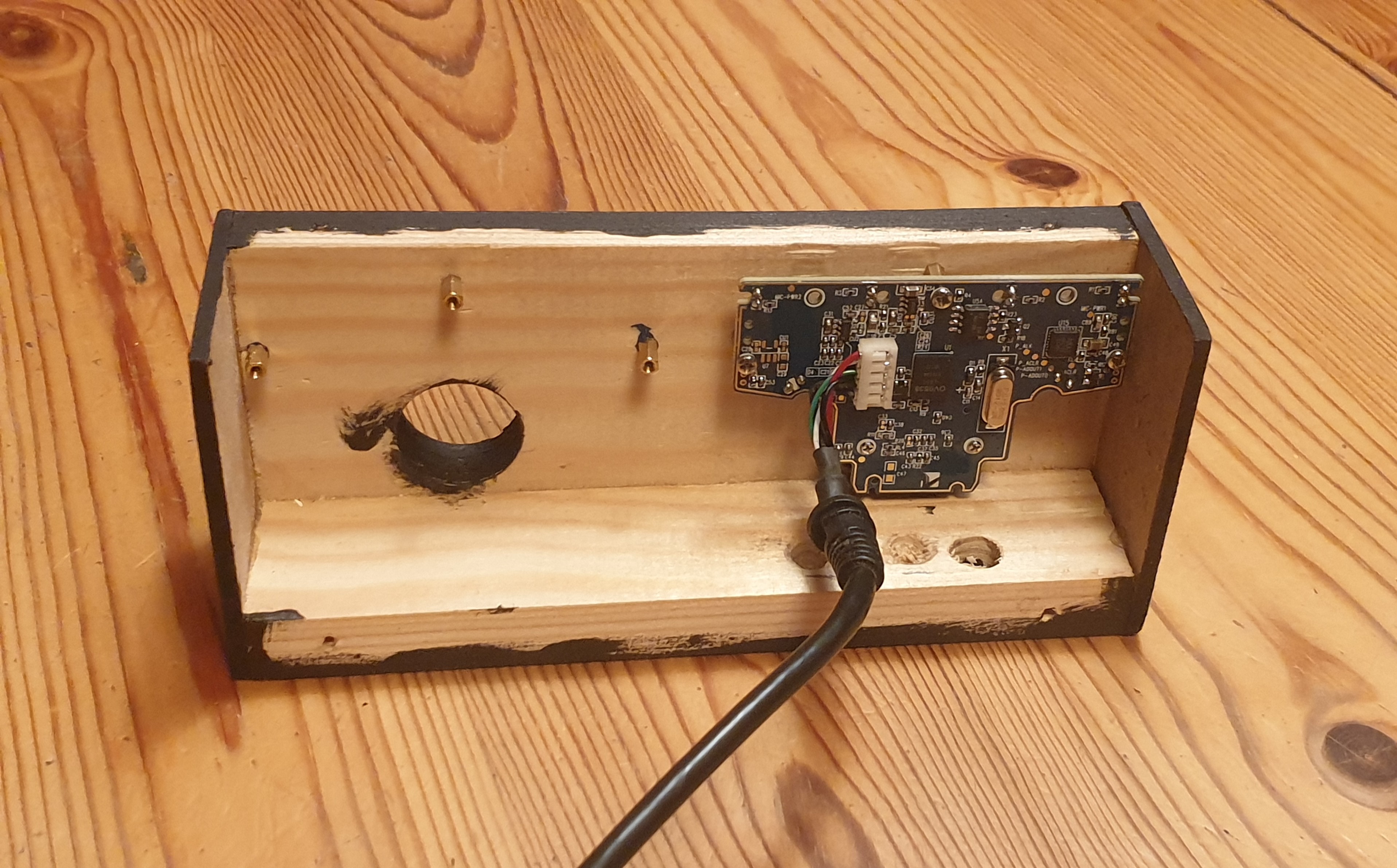 To achieve a stable relative position of the two camera sensors I removed the camera PCBs from their housing and integrated them side-by-side into a self made box made from wooden strips and MDF boards.