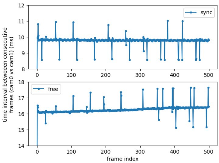 Another way to analyze the timestamp data is to determine the time interval between frames taken with camera 0 vs frames taken with camera 1. Figure 2 shows this data for the synchronized case and the free-running case. In the synchronized case, the time interval is 9.8ms, which is expected because the trigger signals were phase shifted so that each camera starts its acquisition in the middle of the acquisition of the other camera (19.6ms / 2 = 9.8ms). In the free-running case, the time interval has a drift over the 500 acquisitions (10s) that are shown in the figure. The drift is probably caused by the fact that both cameras are running on their own individual clocks. The time interval is around 16ms which shows that the start of the acquisitions of the two cameras is not precisely controlled.