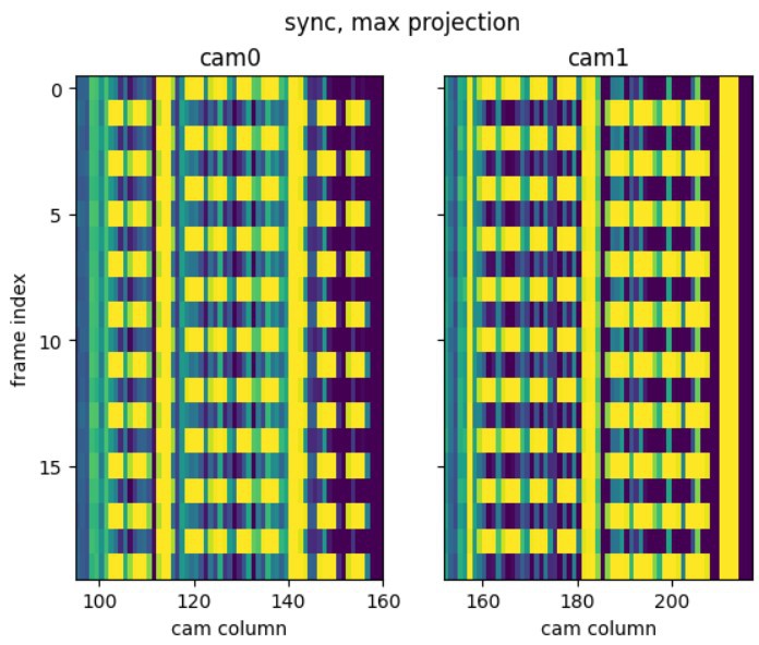 To evaluate the synchronization of the cameras, the cropped images are max-projected and a kinograph is created that shows the projection vs the frame index (Figure 5). It can be seen that both cameras alternate between two states of the running light, as expected because the exposures are phase locked to the running light by the external trigger. Additionally, it can be seen that the two cameras cover interleaving time intervals, as it is expected from the phase shifted trigger signals.