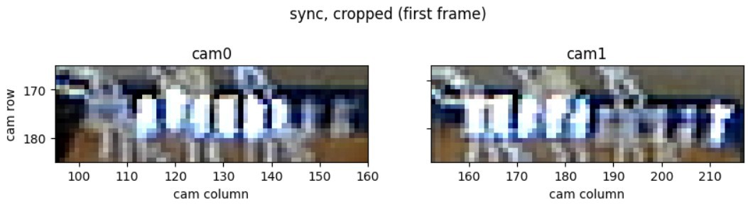 For the further analysis the images are cropped around the ten LEDs that are driven as a running light. Figure 4 shows two example frames for camera 0 and camera 1. In both cases, five or six LEDs are lit, showing that the exposure time is approximately at the expectation of 19.6ms (19.6ms / 3.92ms = 5).