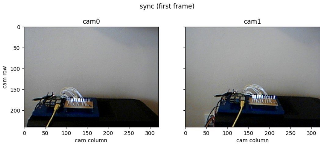 After the successful verification of the synchronized dual camera shown in the last log entry, I will finish the highrate_longexp project and integrate the dual camera into my other project lalelu_drums. The following video shows a preview. In the foreground, the new dual camera can be seen, that is used to capture the gestures of the player. The percussion sounds are triggered from the gestures in real time. Due to the longer exposure times that are now possible, the illumination of the scene can be reduced compared to the arrangement with a single camera. I will cover the details of the integration in an upcoming log entry for lalelu_drums.