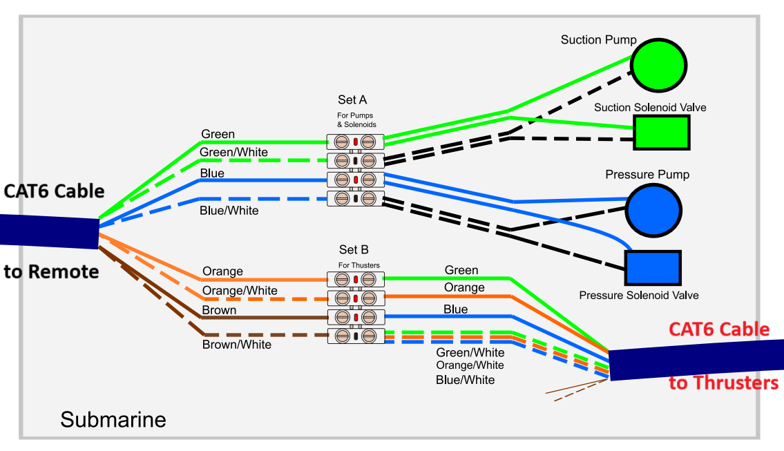 All functions are controlled through a custom-made wired remote using a CAT6 cable that connects to the submarine: