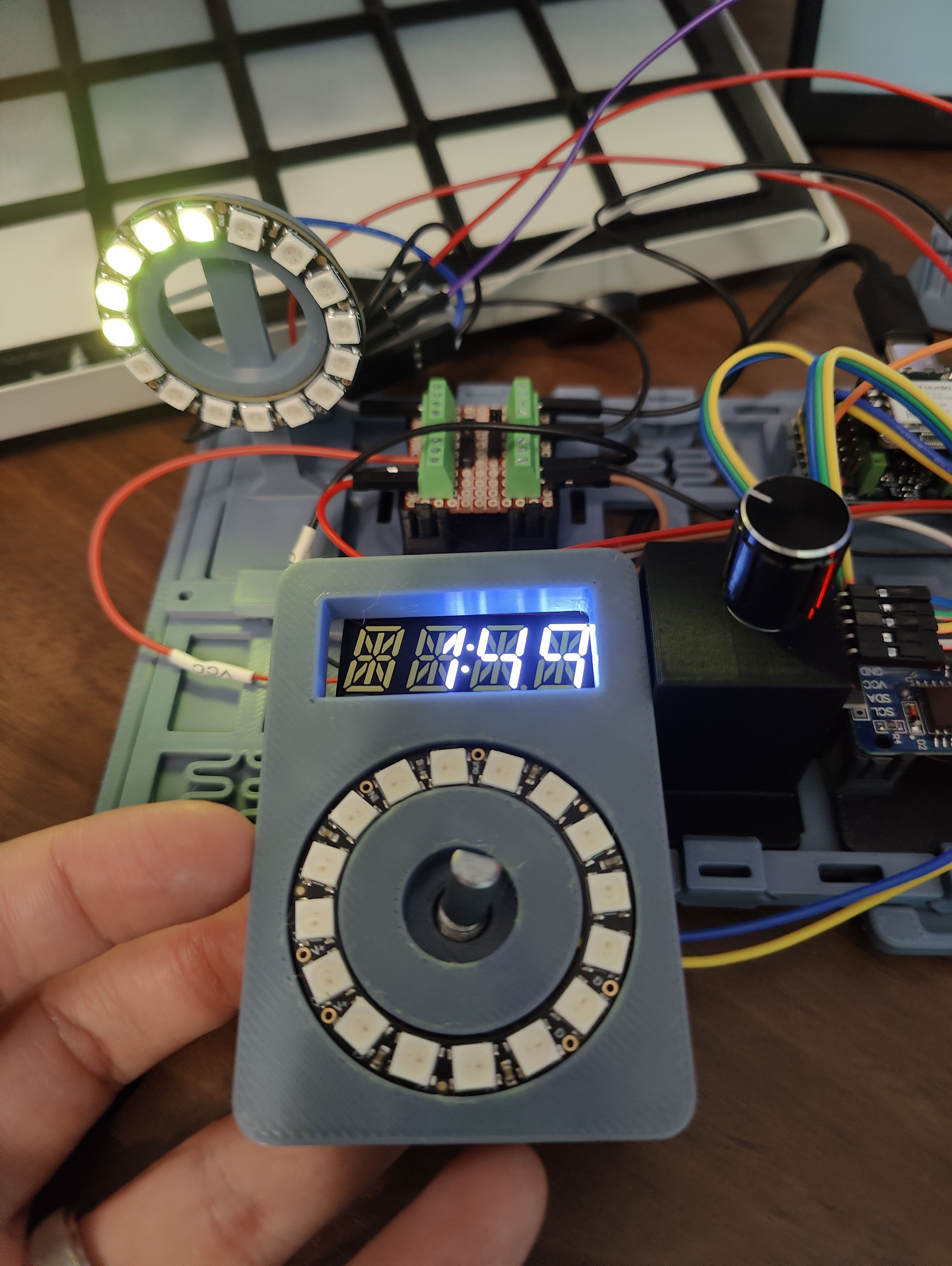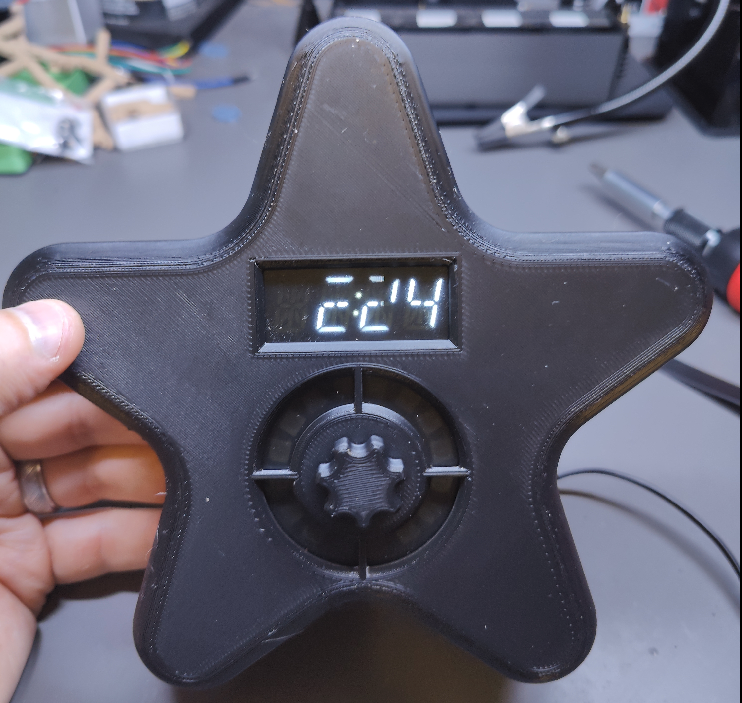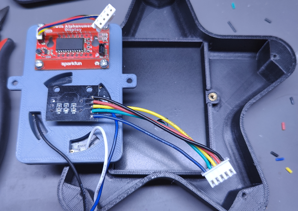 With everything assembled… nothing worked. According to some serial debugging, the I2C addresses I was expecting to find the display and RTC at were missing, and nothing I did could get the LED ring to light up. The I2C issue ended up being a loose connection, which was fortunately quite easy to resolve. The LED Ring… that was from me trying to cheap out and use a single transistor like a logic-level converter. I’m looking into a better way to do it in the future, but for the time being, I just manually wired in a 4ch logic-level converter I had on hand. A bit wasted here, but it works.