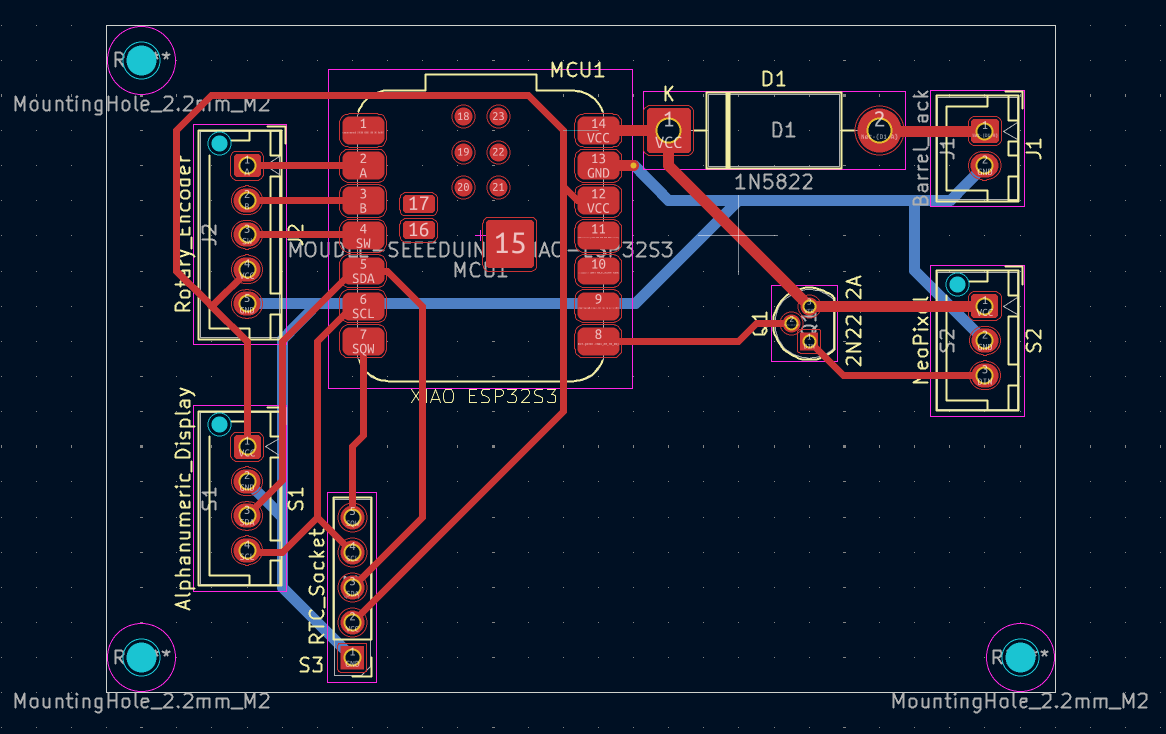 The software has seens some upgrades as well. The dial can now be used to adjust the brightness of the display and LED ring, start a nap, and lock the display. The switch has to be held for 3s to unlock it again. This is all the functionality I had intended to include for local control, at least for the MVP, so I think the software changes will slow down for a bit now. I have started work on designing a PCB in KiCad, and building PoC for it on perf-board. I've also started working on a design for the case.