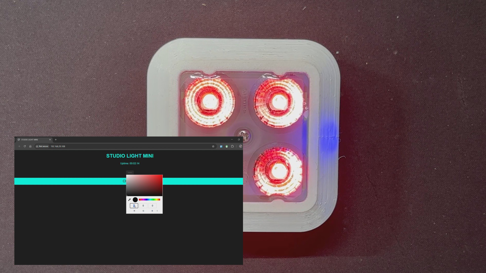 Our Setup is powered by an ESP8266, with a custom 3D-printed lens and enclosure to make the most of only four WS2812B LEDs. The web app is where the magic happens: it's simple, responsive, and works on any device. I've used my phone, laptop, and ROG Ally to control it. Simply select a hue and it refreshes instantaneously, allowing us complete creative freedom no matter where I am working.