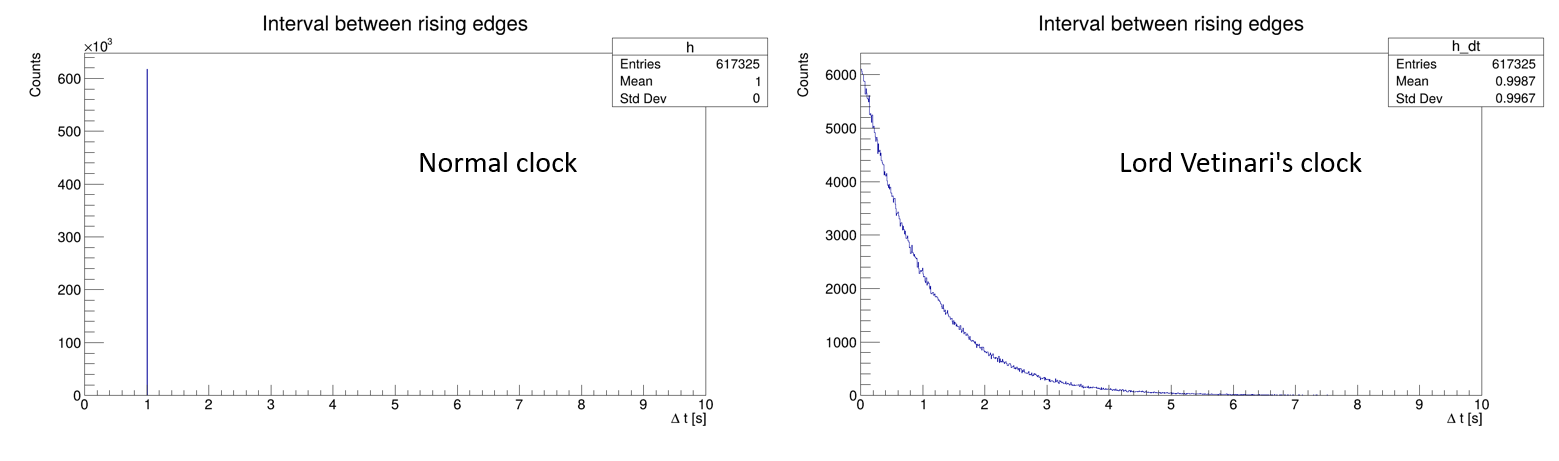 In order to have some immunity to background radiation I used a coincidence measurement of the most common two products from Am-241 decay: an alpha particle and a 59.5 keV gamma. When an Am-241 nucleus decays it emits an alpha particle (two protons and two neutrons) and turns into Np-237. Most of the time the Np-237 has some left-over energy that it quickly emits as a gamma ray. If we detect an alpha and a 59.5 keV gamma ray appearing at the same time we can be fairly sure this came from our Am-241 source, not some background radiation that we have no control over. Adjusting the geometry of the setup one can change the rate of these coincidences until an average of one event per second is detected. On a long timescale this can be used as a timebase, as Physics is very kind in that regard. But on a short timescale events have the characteristic randomness of radioactive decay. Perfect for Lord Vetinari's clock.