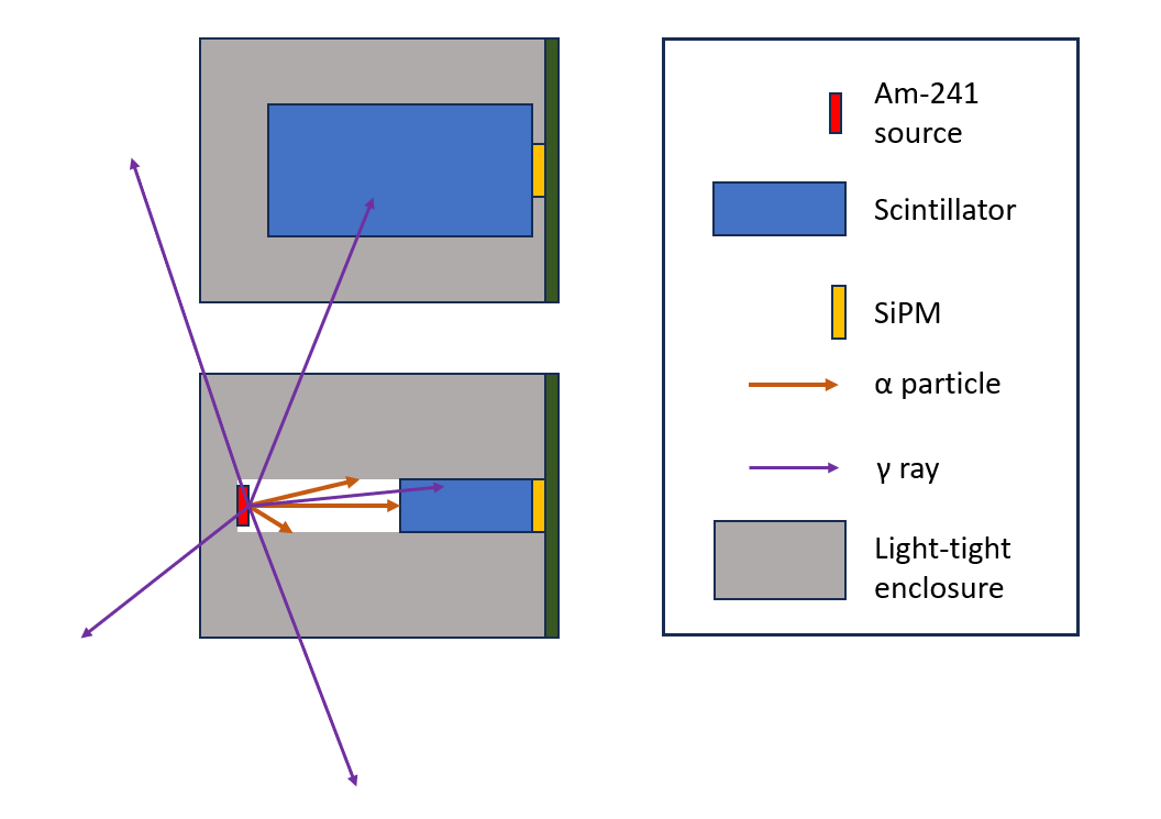 Two of the Pomelo detectors I'm working on are run in coincidence, such that they deliver a pulse output only when both fire. One of them detects gamma rays, whereas the other detects the alpha particles from an Am-241 source. The second detector is made sensitive to alphas by having the radioactive source fixed inside the scintillator housing with a clear path for the alphas to hit the scintillator.