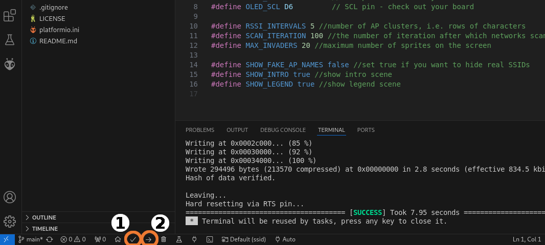 Press Platformio:Build and then Platformio:Upload button to upload the code.