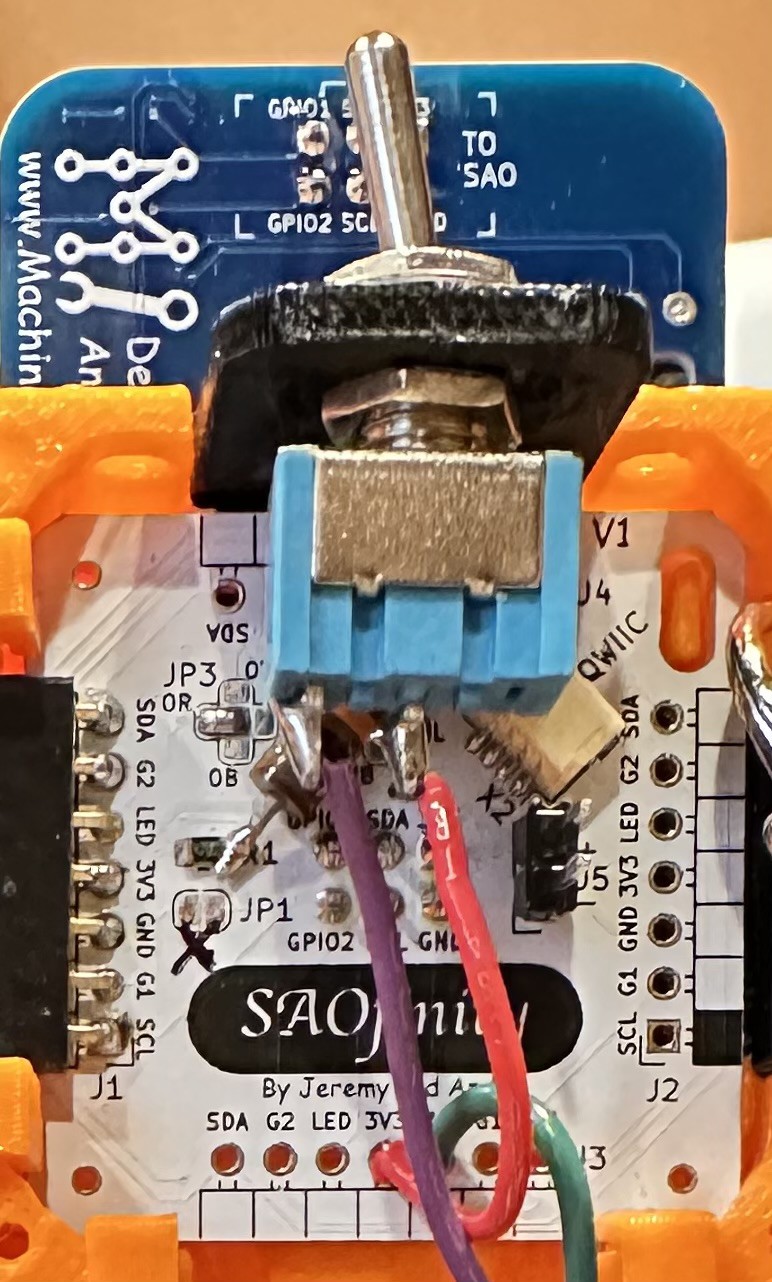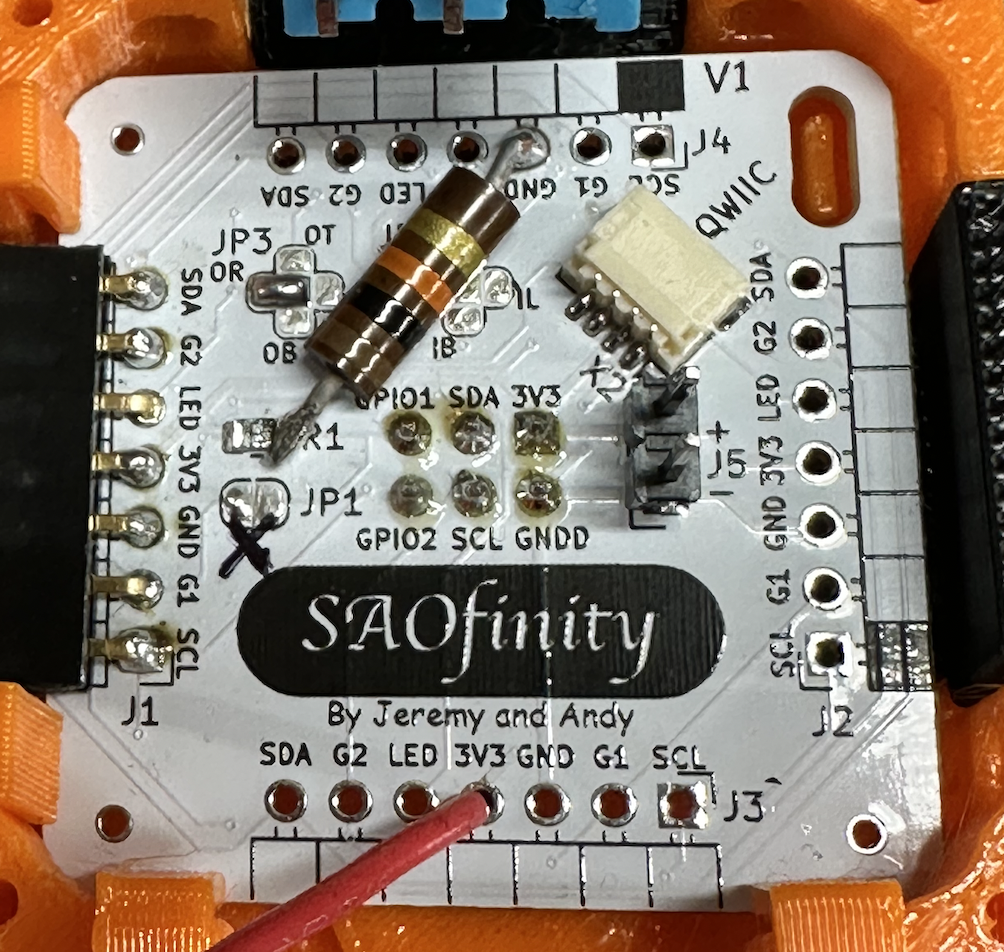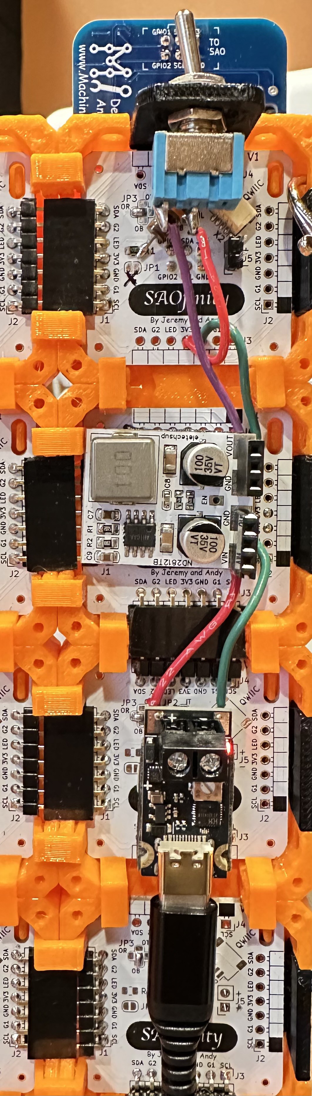 4. Wire up the power pins to 3.3 vdc. I simply used a step-down power regulator board powered from USB 5 vdc and daisy chained all the connectors. There are many options for power, just be sure to verify the polarity and voltage before plugging SAOs in.