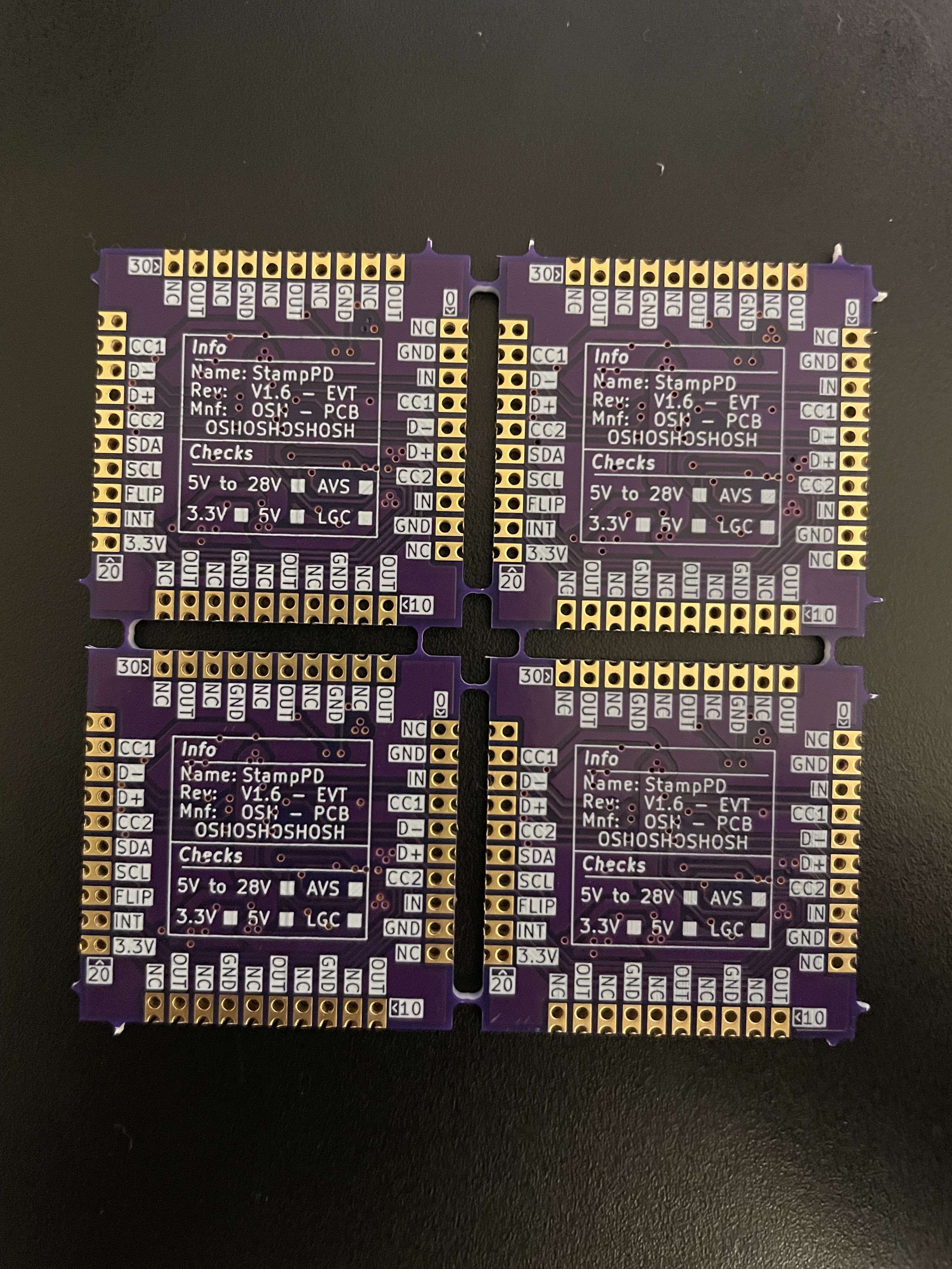 My goal for EVT is to test the PCB and Components to make sure StampPD works correctly. I also want to validate some cost cutting decisions for the PCB that will be explained below. For the EVT iteration I will be hand assembling PCBs to get an understanding of component assembly issues, silkscreen confusion, and to make any necessary PCB fixes easier. My target quantity of StampPD EVT boards is 10 working prototypes but I ordered Components/PCBs for 12 boards to account for mistakes, broken components, and potential destructive testing.