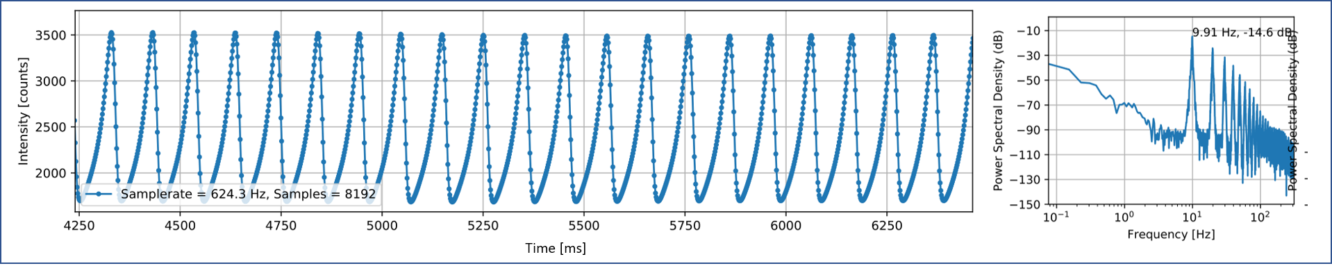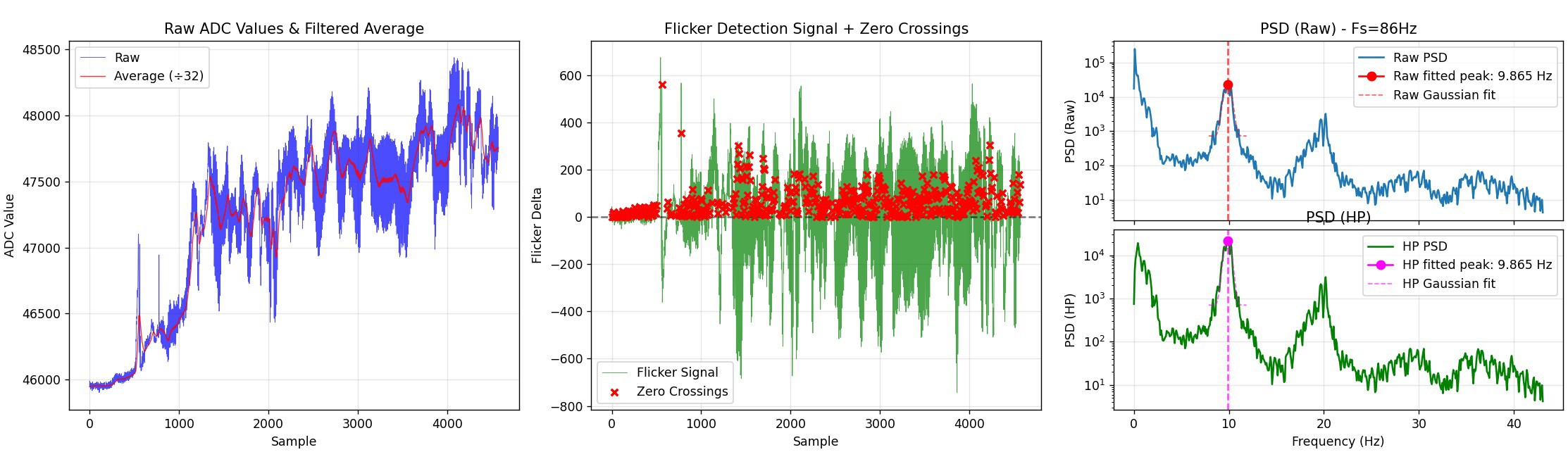Signal processing pipeline: raw data, baseline extraction, and frequency analysis The image above shows an overview of the signal chain. The raw data (after 32x averaging) is shown on the left. The signal is filtered with an IIR filter to extract the baseline (red). The middle figure shows the signal with baseline removed and zero-cross detection. The zero-cross detector will tag the first sample after a negative-to-positive transition with a short dead-time to prevent it from latching to noise. The right plot shows the PSD of the overall and high-pass filtered signal, showing that despite the wandering input signal, we get a sharp ~9.9 Hz peak for the main frequency.