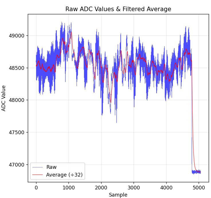 I recorded data traces with a Python tool from the monitor output and used a separate script to analyze data and prototype the signal processing chain. The sample rate is limited to around ~90 Hz due to the overhead of printing data via the debug output, but the data rate turned out to be sufficient for this case.