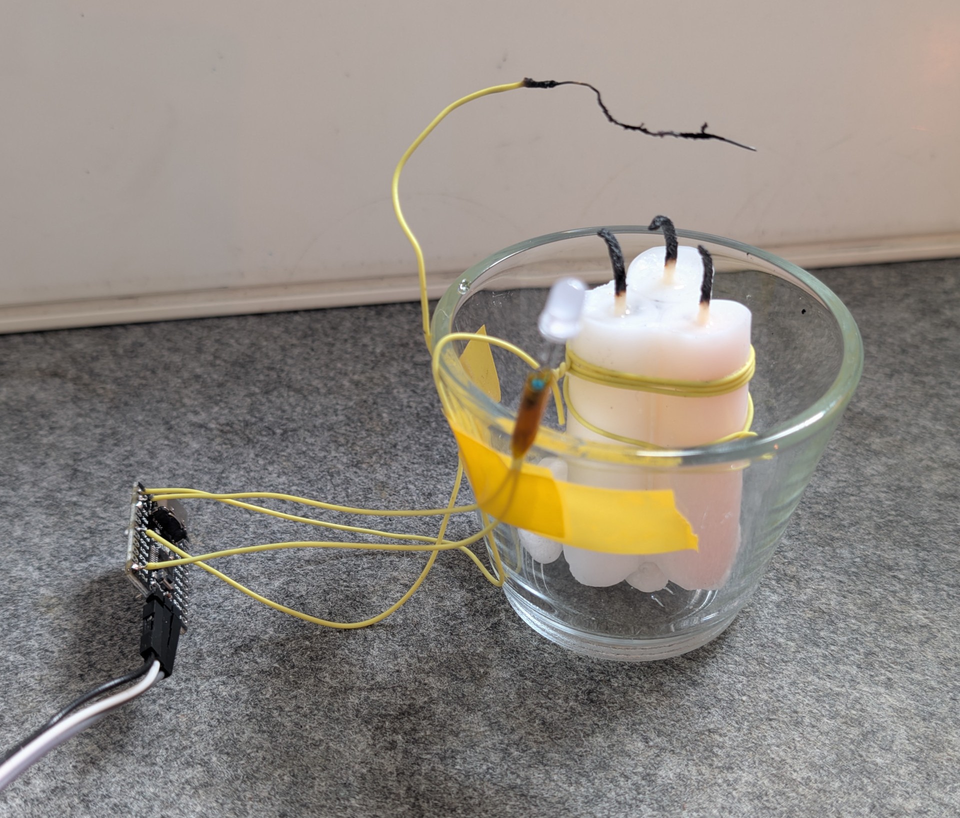 To implement the capacitive sensor, I opted to use a CH32V003 microcontroller with the CH32fun environment. You can see the full contraption below: the microcontroller is located on the small PCB to the left. The capacitance is sensed between a wire suspended in the flame (the scorched one) and a ground wire that is wound around the candle. The setup is completed with an LED as an output.