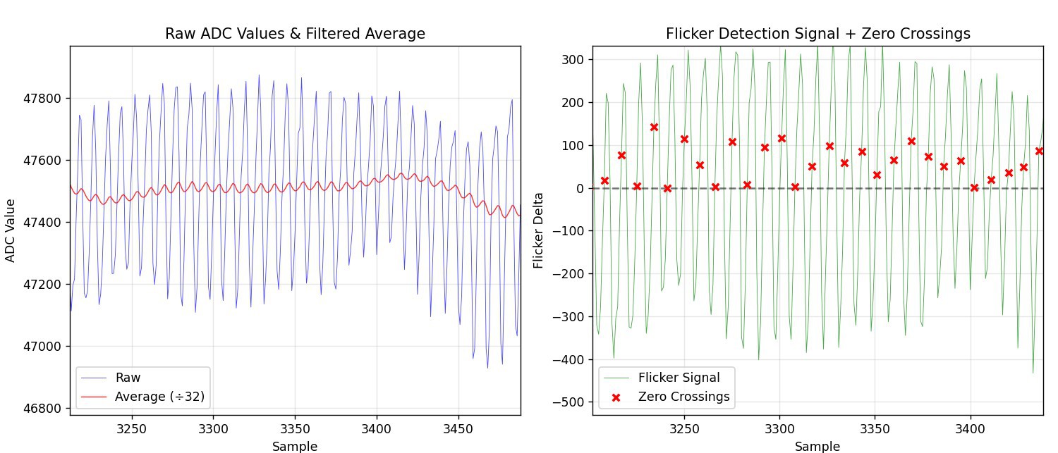 Detailed view of raw signal, baseline, and high-pass filtered data The inner loop code is shown below. Implementation of IIR filter, HP filter, and zero-crossing detector are demonstrated. Conversion from 9.9 Hz to 1 Hz is implemented using a fractional counter. The output is used to blink the attached LED. This shows the concept nicely! An advanced implementation using a software-implemented DPLL might provide a bit more stability in case of excessive noise or missing zero crossings, but that's for later...