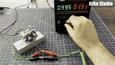 Step 2: Set the maximum current output to 1A. This can be done by directly shorting the pins of the power supply and then turning the current control knob. If you don’t have this feature, use a multimeter and a low-resistance load to set the value to 1A. For this, your power supply must have a current controlling knob. (See the GIF)