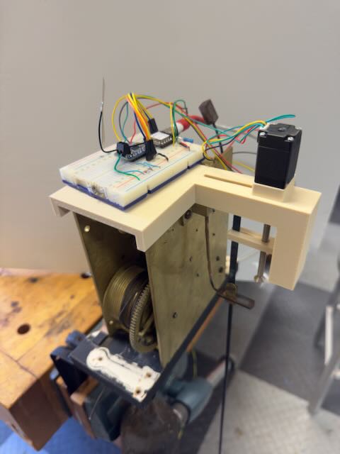 The first rule of old clocks is that changes must be reversible. Don't drill any holes or permanently attach modern hardware. So a 3D printed bracket rests on top of the works. An arm extends down behind the pendulum holding a clip that slides up and down the spring that holds the pendulum, changing the pendulum’s length and the timing of the clock.