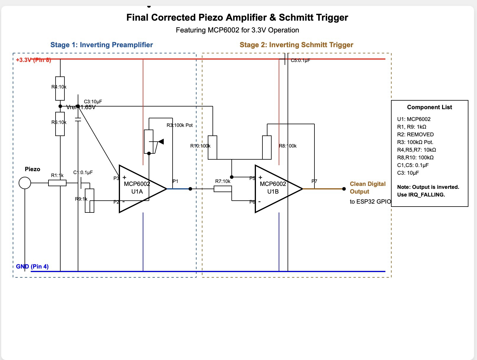 A piezo sensor taped to the clock's back plate provides the pendulum timing. The sensor is connected to a dual op-amp. One section of the op-amp amplifies the piezo signal 47 times. The other section is a Schmitt trigger providing a clean pulse to the ESP32C3. The circuit is shown below. This is well outside my expertise, but Gemini made it possible.
