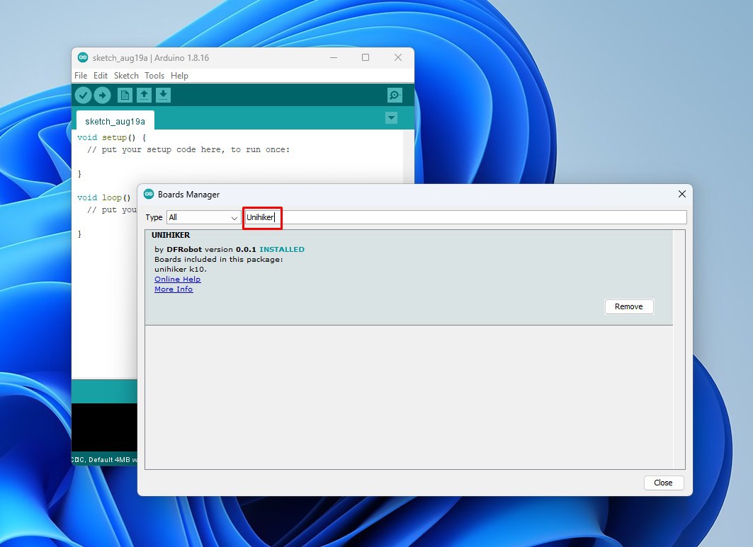 Then in Tools-> Boards Manager we write Unihiker, and we install the support for Unihiker from DFRobot.