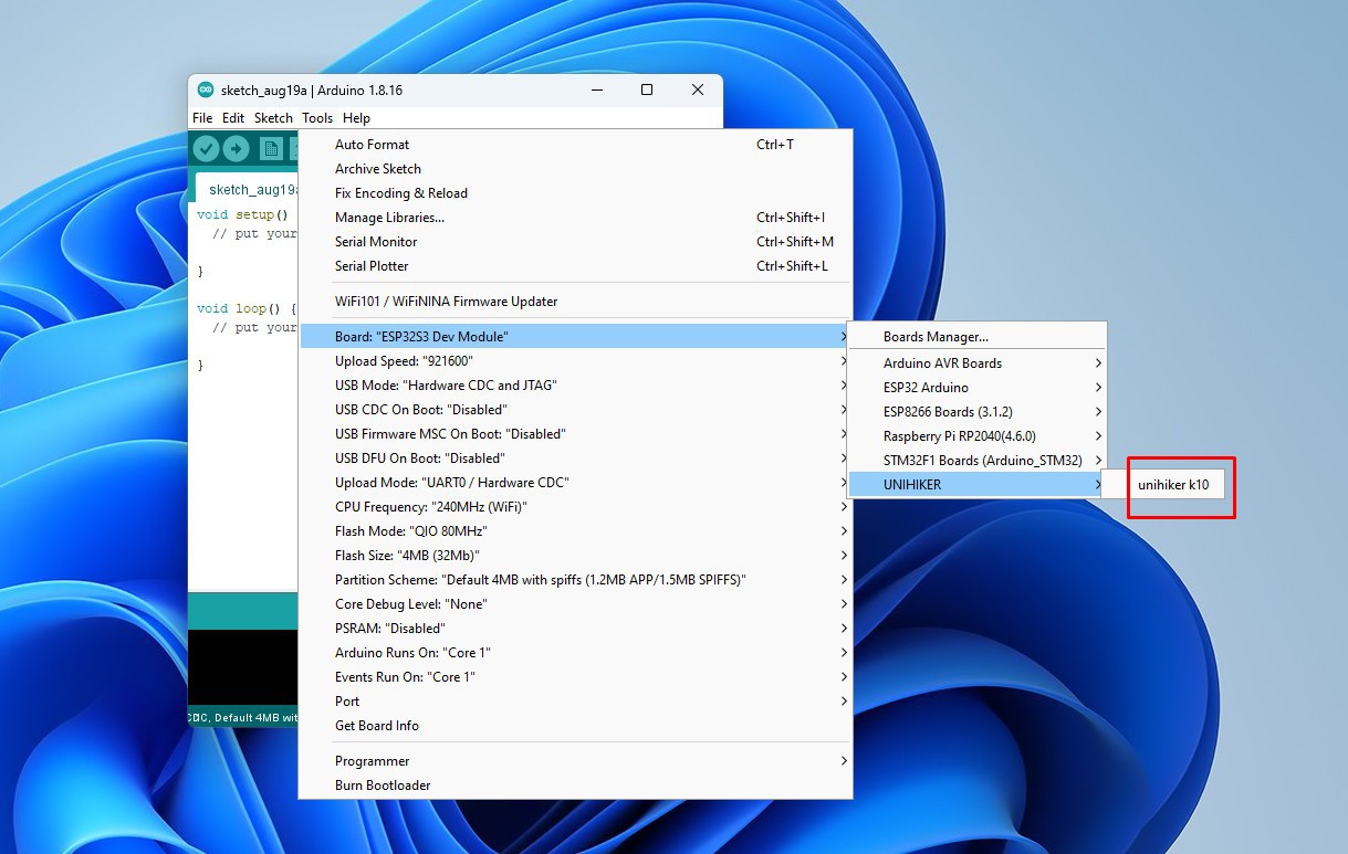 Now we go to Tools -> Unihiker -> Unihiker K10.
