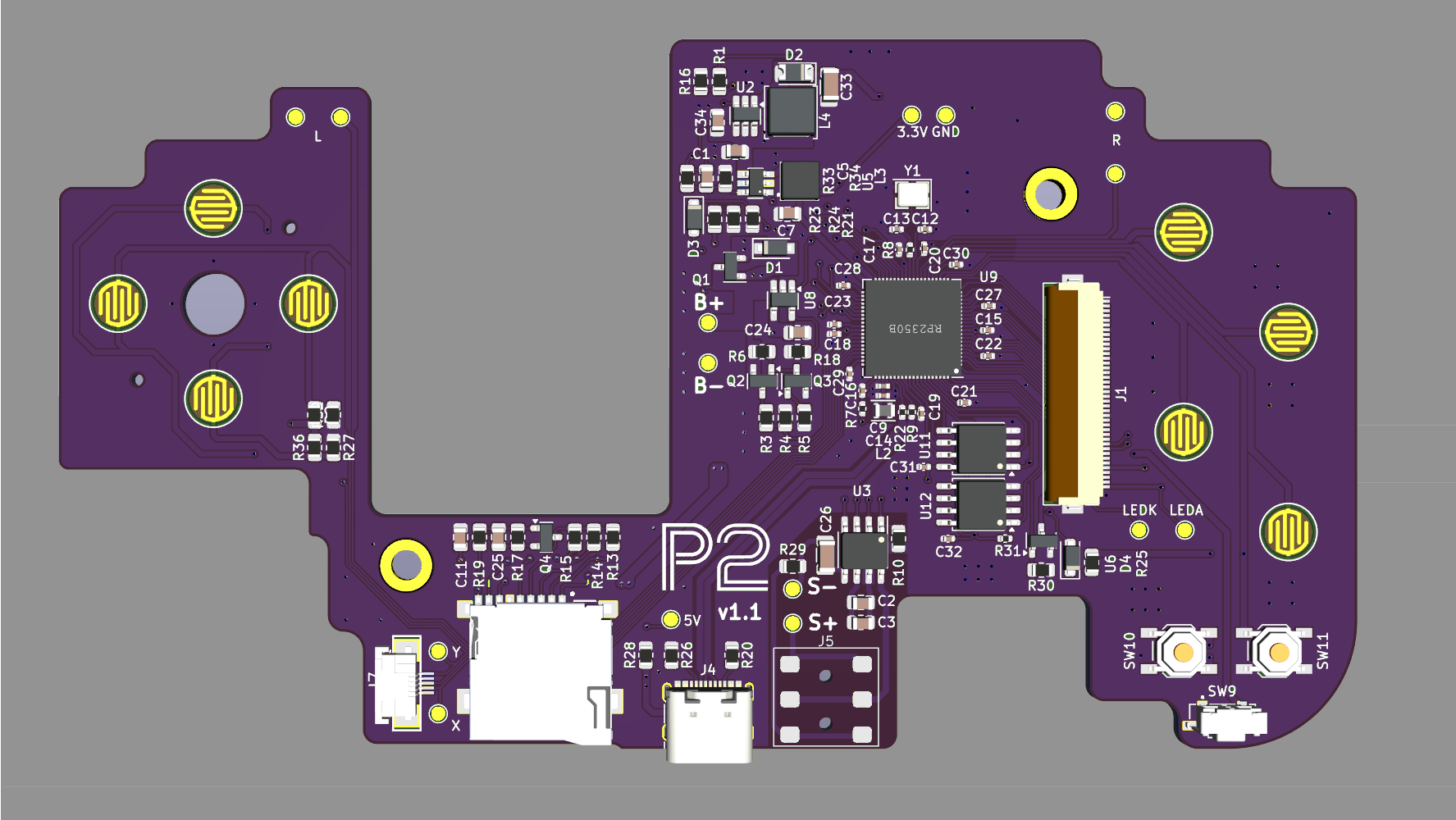 The PCB is a 1.6 mm, double-sided board based on a reference design for the RP2350. Careful routing allowed me to keep it as a two-layer board, which reduces production costs in case you want to build one of your own. It has a 3.3V buck converter for the main voltage supply, a boost converter for the onboard LCD, and a LiPo charger.