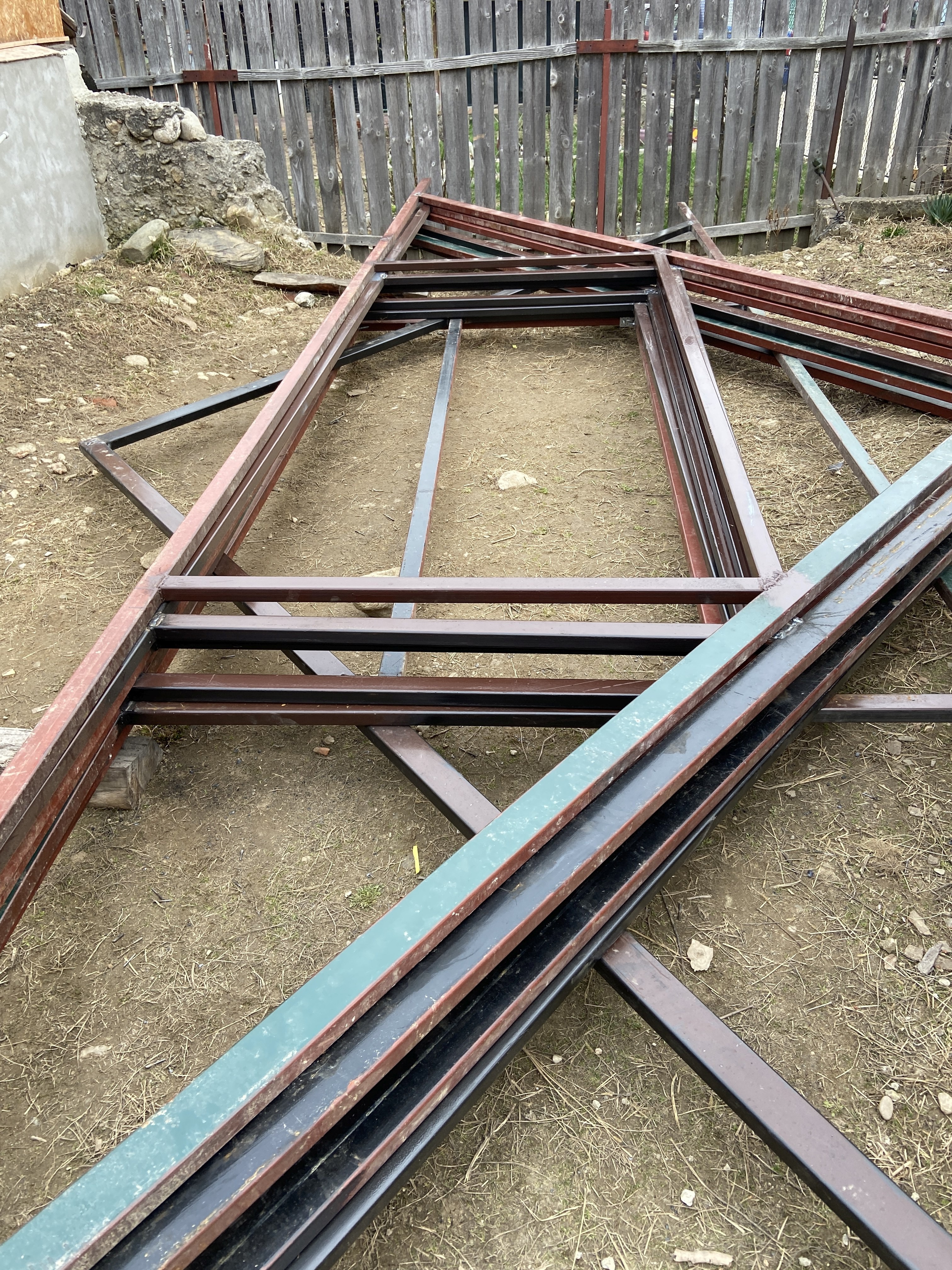 Initially, I intended to build everything in Lego style, without welding, only by mechanical fastening. The beams, rafters, etc. should have been connected only by screws. I built 2 trusses in this way, but then I gave up because the iron at that length (7m) was deforming and the components were no longer joining properly.