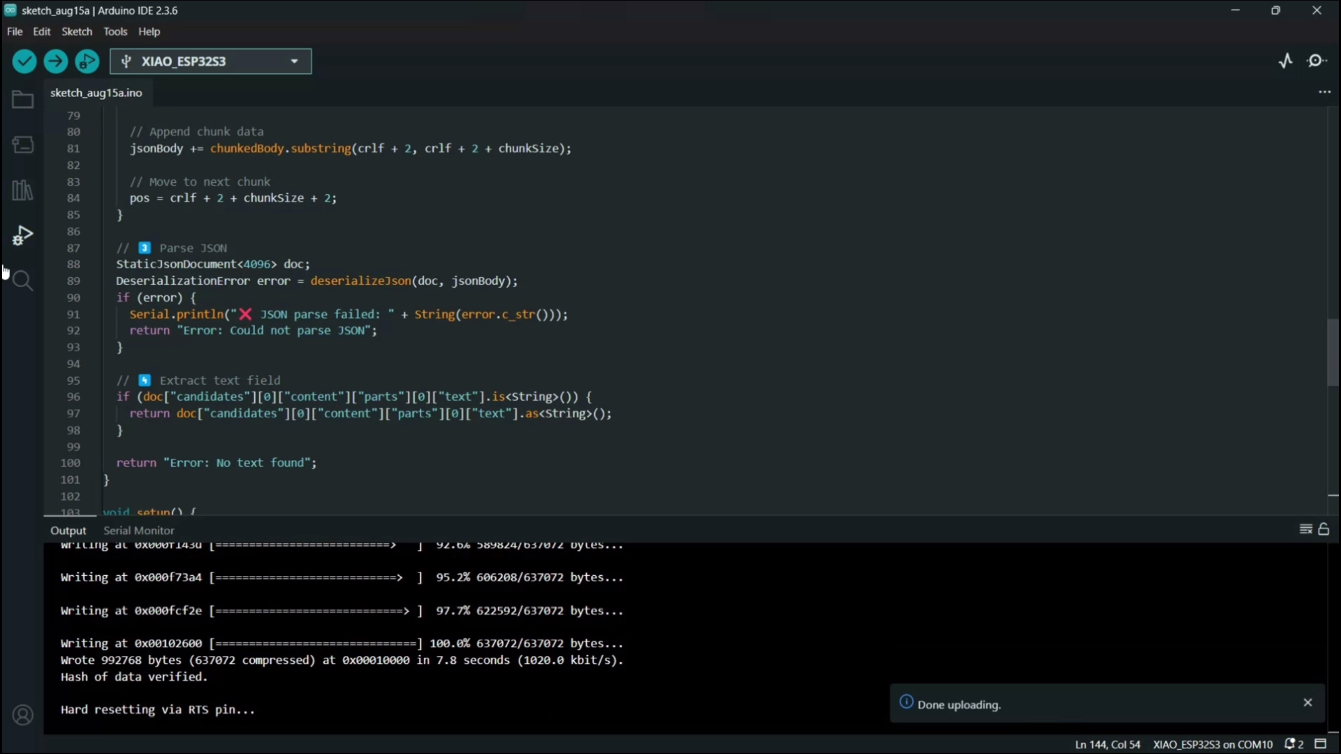 - Watch the output to confirm that the XIAO ESP32S3 connects to Wi-Fi and starts the bot.