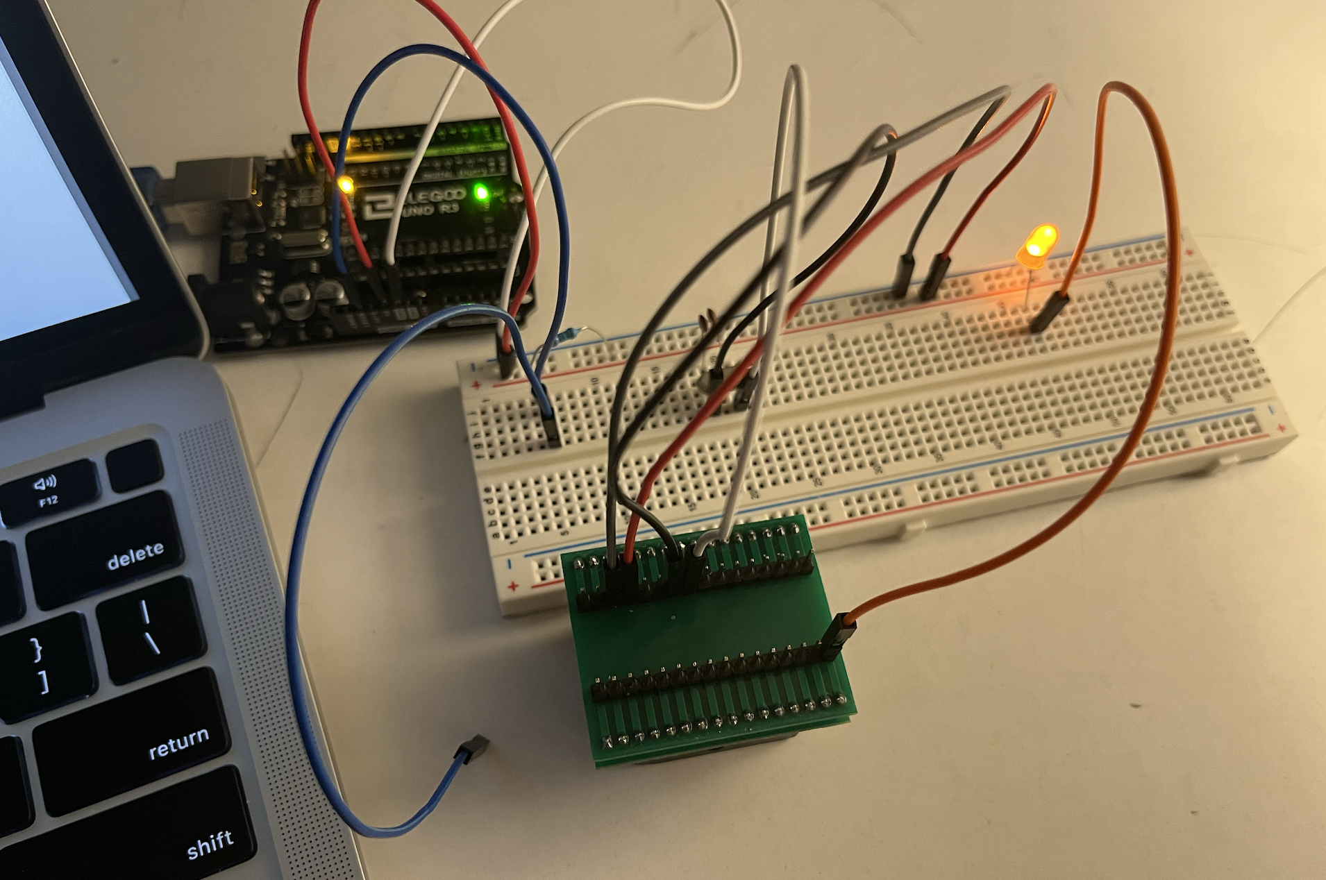 Once I had each component connected on the breadboard, I was able to begin programming the main microcontroller (ATmega328P-AU). To do this, I connected my laptop to an Arduino Uno to send binary code to the ATmega328P.
