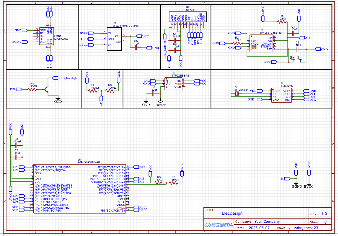 After I had verified that all of the software and hardware were working correctly, I could get started on making the PCB for the watch. To do this, I first had to make a schematic with EasyEDA. The schematic shows how everything is to be connected in the final version of the watch and serves as a guide for designing the PCB.