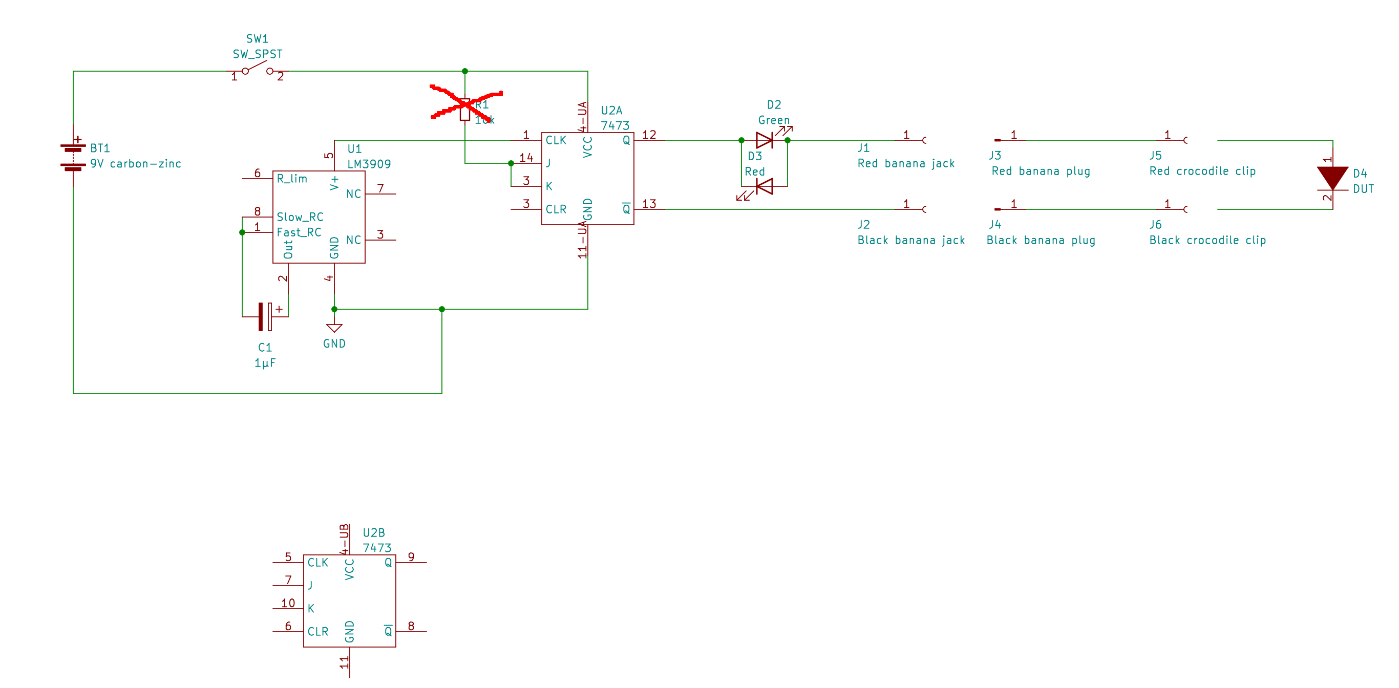 The idea to use the 3909 came later. Radio Shack sold blinking LEDs at the time. The first version of the diode tester had a blinking LED connected to the clock input of the 7473. Since the LED blinked at like once per second, the test LEDs also alternated slowly. My dad wanted to have the appearance of both LEDs lighting simulataneously, so he needed a faster oscillator.