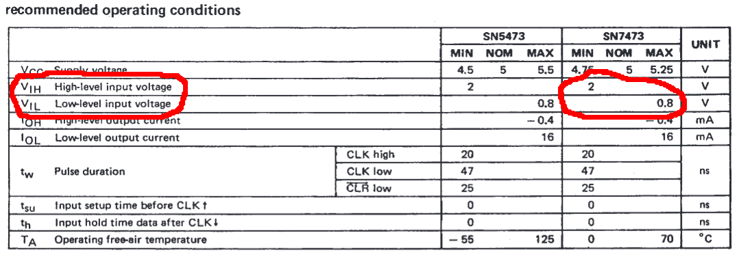 According to the 7473 datasheet (https://www.ti.com/lit/ds/symlink/sn54ls73a.pdf?ts=1768011311799) it takes a signal below 0.8V to register as a low and a voltage of 2V to register as a high.