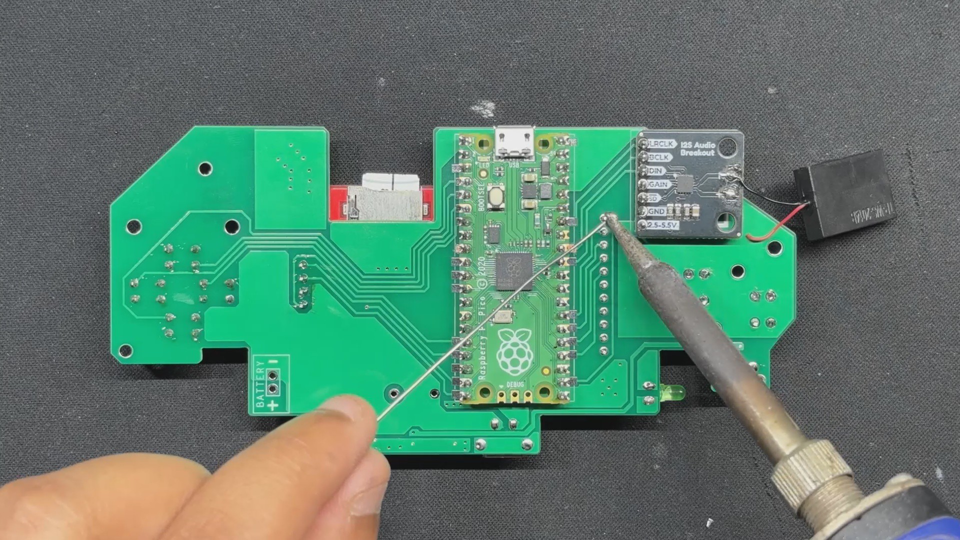 By following the PICO GB pinout info found on their GitHub page, I was able to make a simple circuit that houses the PICO display and the sound module together along with buttons for controls.