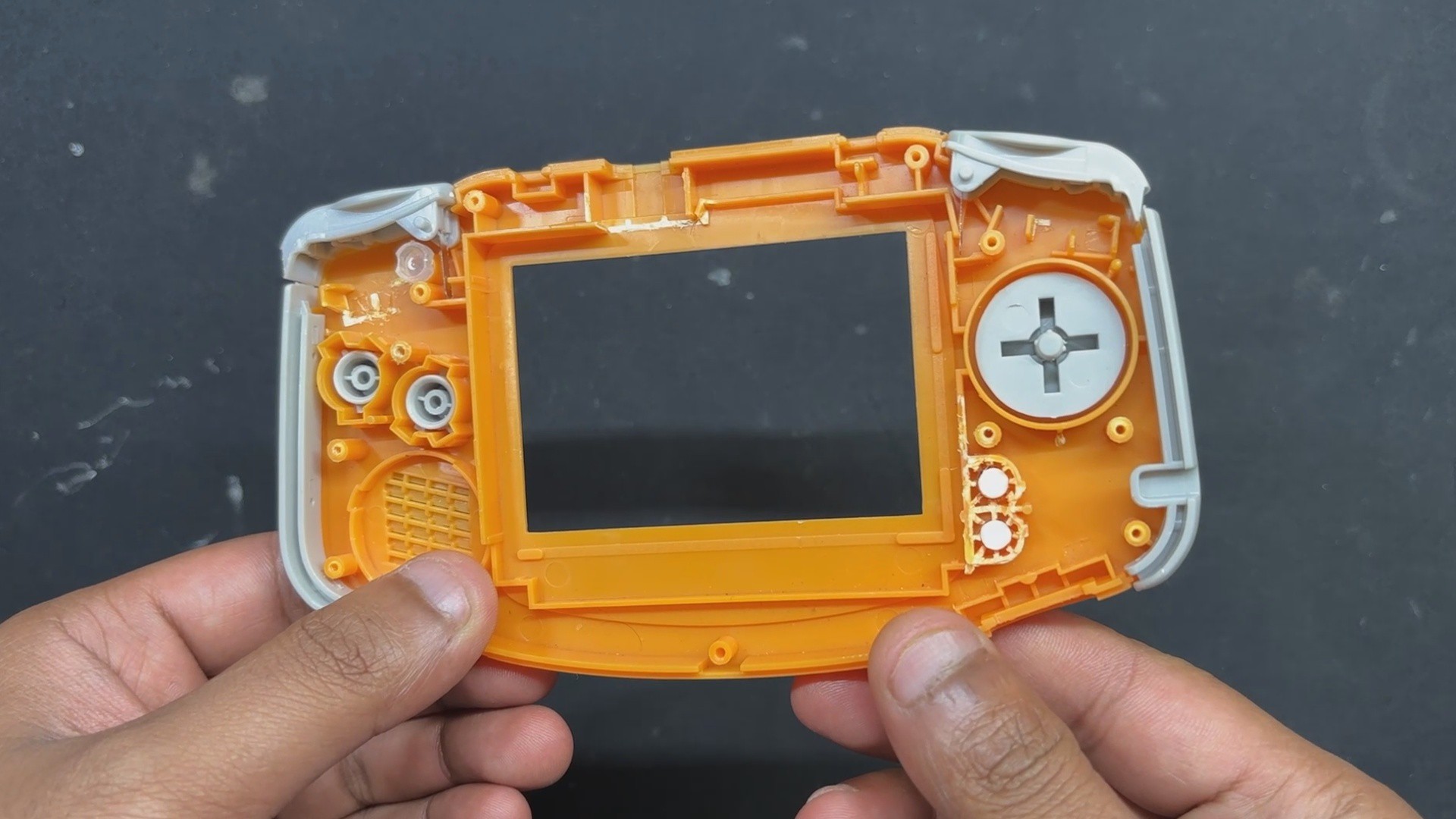The D-pad, A, B, and trigger buttons are all included in this shell, along with the front and rear enclosure and a few more pieces on the left and right sides of the device.