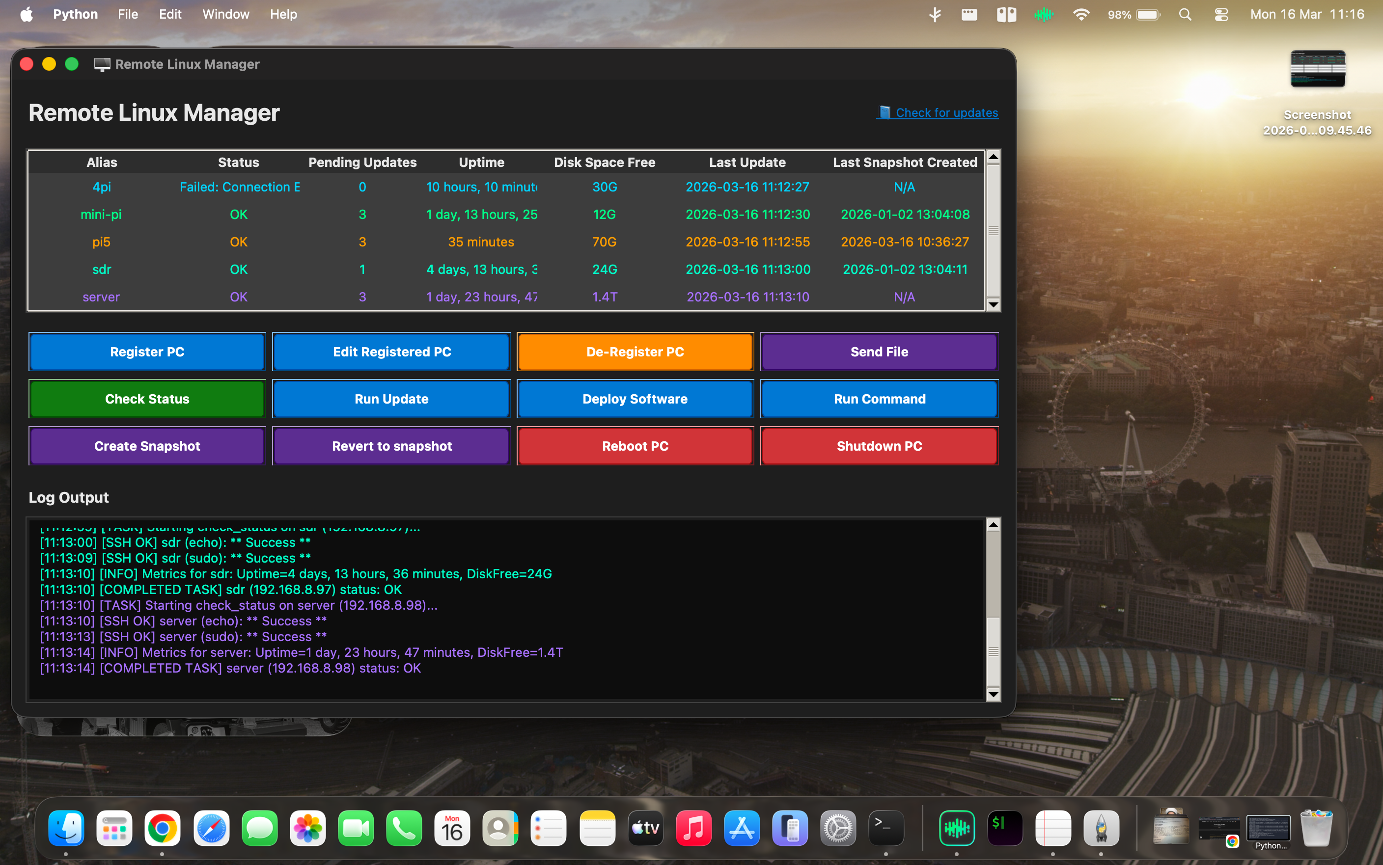The Remote Linux Manager is a secure, multi-threaded GUI application designed for the mass administration of Linux PCs over SSH. While optimized for Ubuntu-based systems, it provides a unified interface for managing any remote Debian based Linux environment.