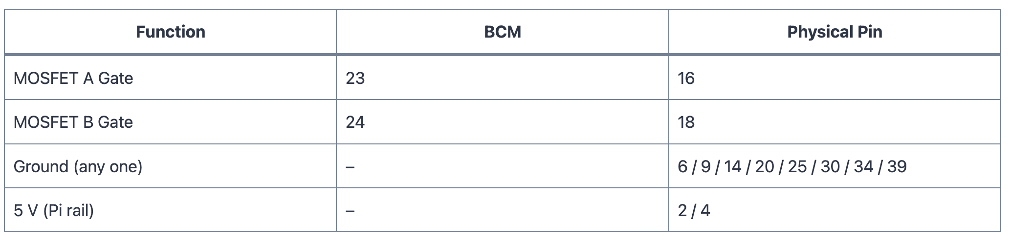 Pin Map (BCM → Physical Header Pin)