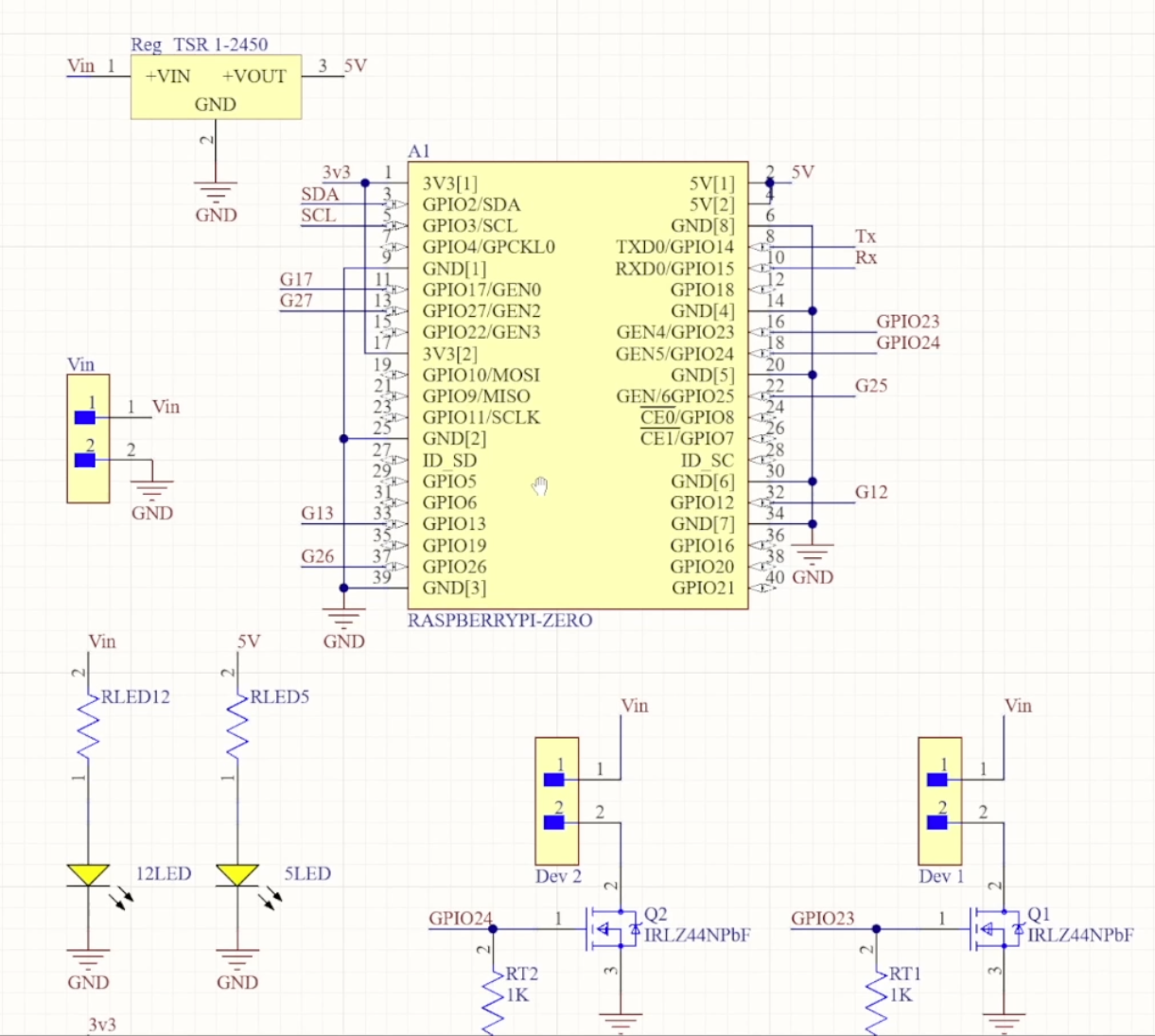 - 5 V supply for the Pi: USB 5 V or TSR 1-2450 switching regulator (drop-in 7805 replacement)