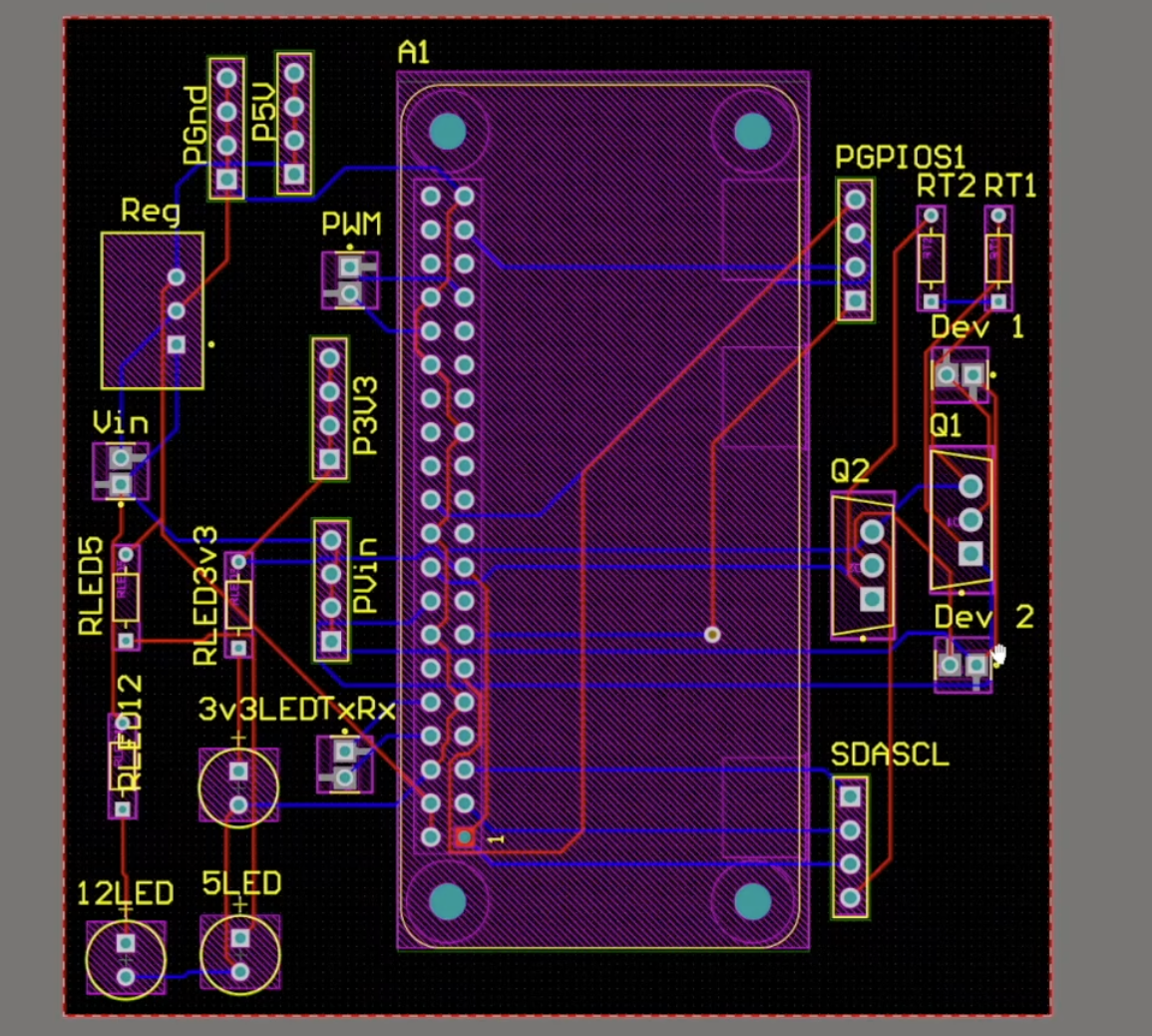 - Each device connects from +12 V → Device → MOSFET Drain.
