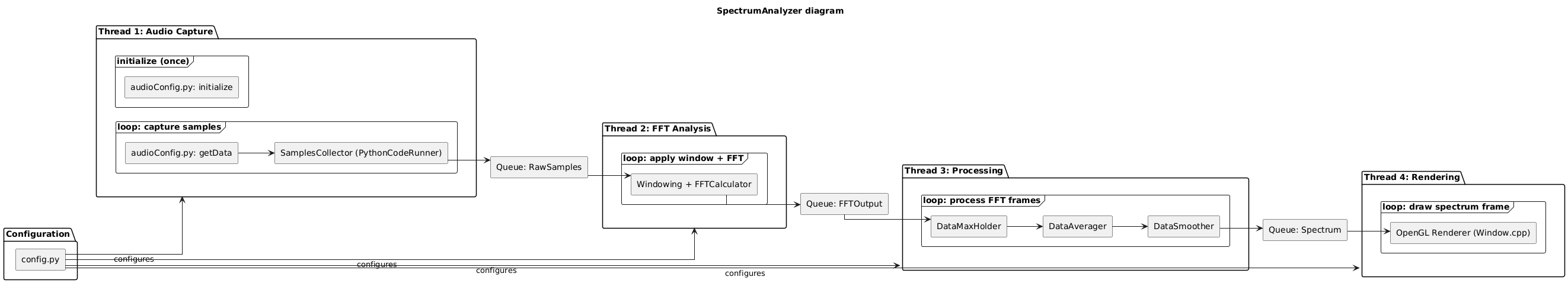 The core of this project is the AudioSpectrumAnalyzer class, which manages the entire process using several parallel threads for real-time performance: