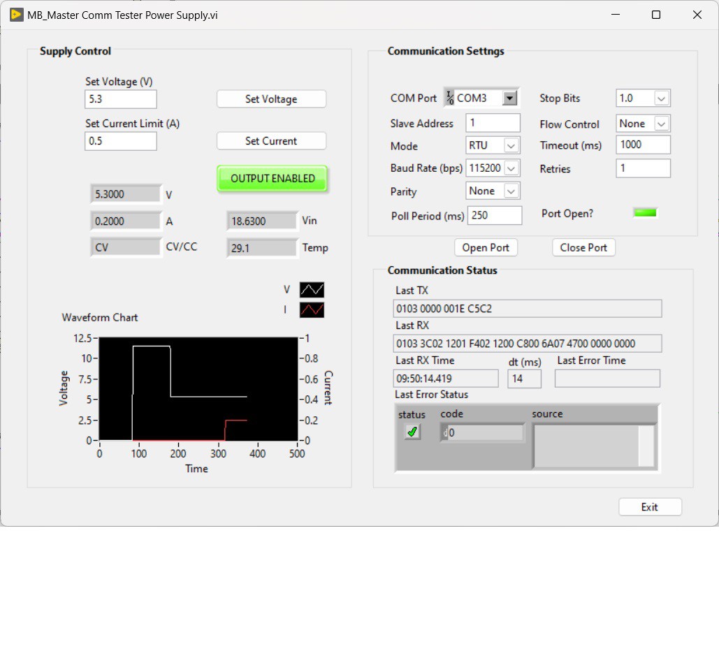 For my own testing, I used the LabVIEW MODBUS toolkit available on GitHub, created by Ryan Porter: