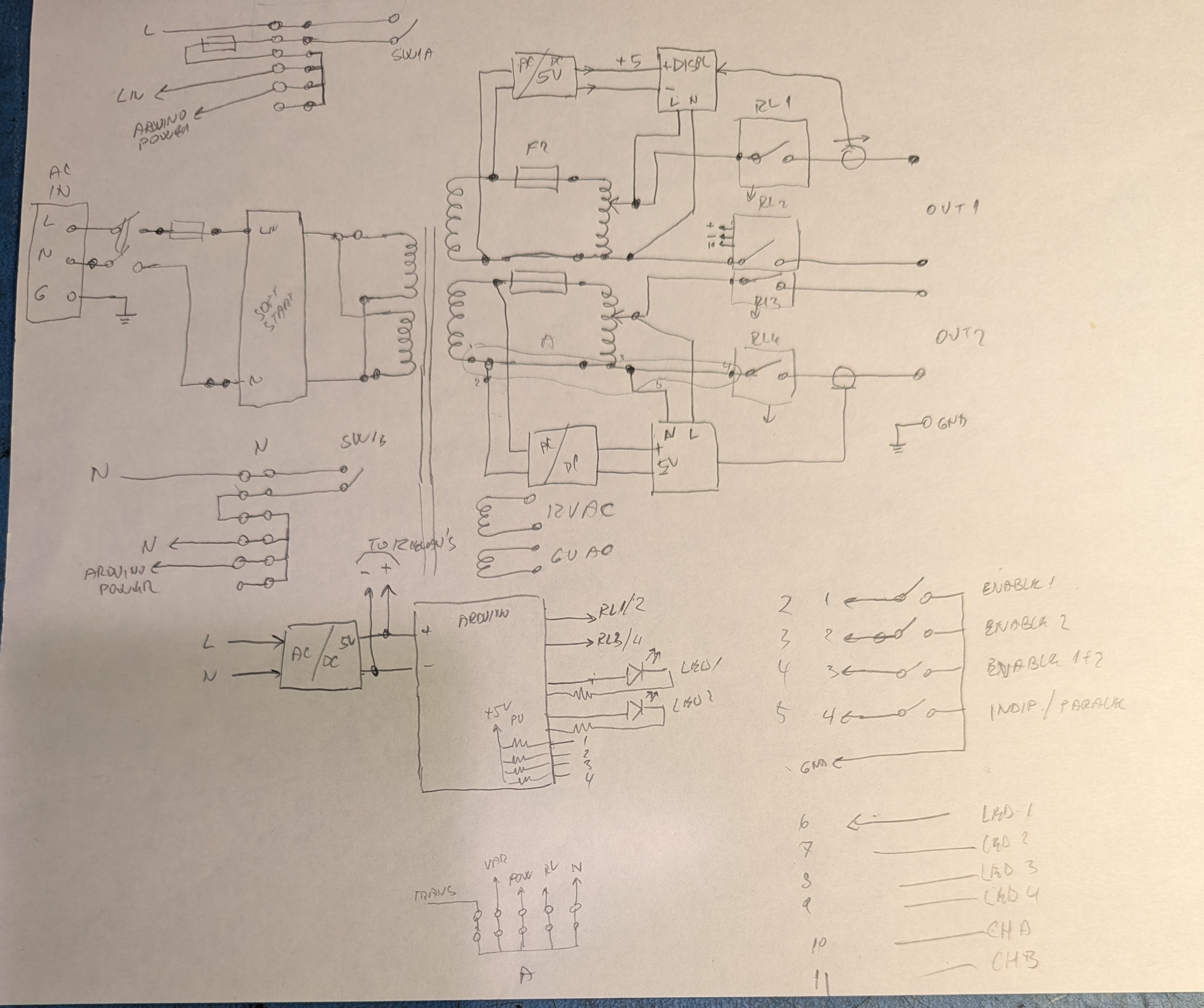 This project was inspired by a large isolation transformer I found at a very low price and my need for a dual AC source. The chassis came from an old Altec Lansing amplifier that I purchased for $10. I used a soft-start module from eBay, which I had to modify to operate on 120 VAC since I hadn’t noticed the original specifications when I bought it. The isolation transformer provides two isolated 120 V outputs, each connected to a variable transformer through a relay board controlled by an Arduino Nano. The output voltage and current are monitored using two LCD modules from Amazon. I didn’t spend much time on documentation, but I do have a simple working sketch.