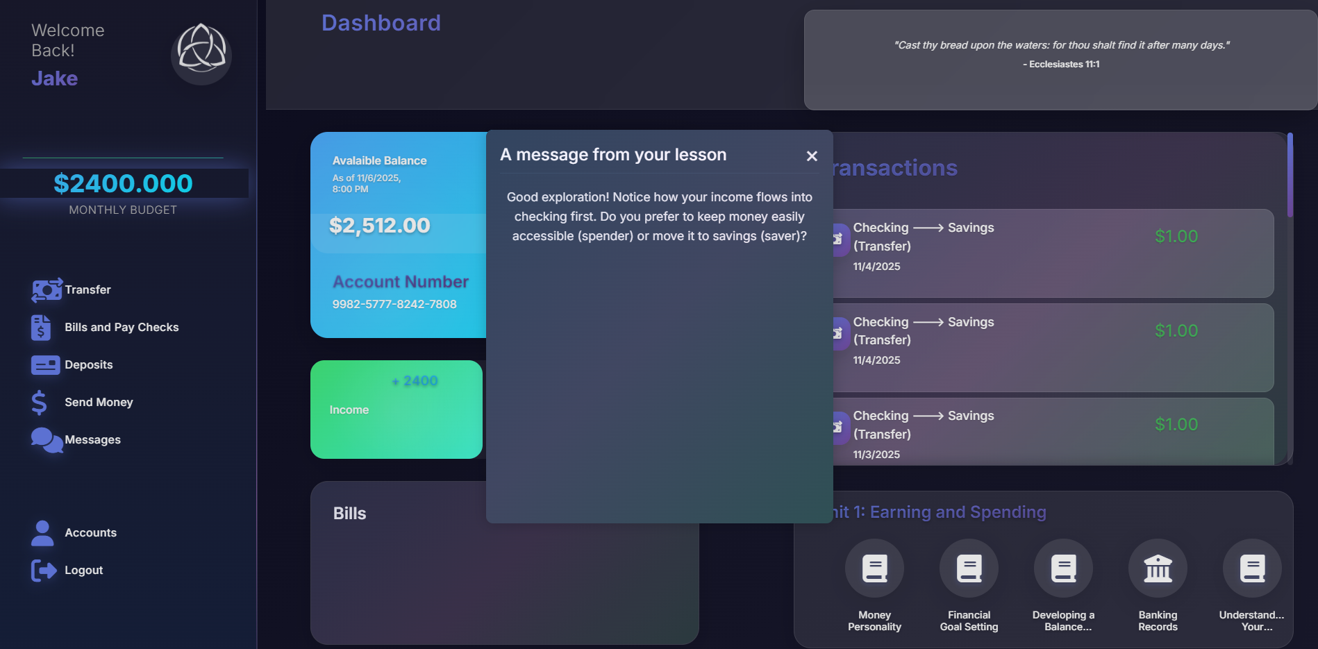 Trinity Capital is an interactive financial literacy platform built for high school students, designed to bridge the gap between classroom lessons and real-world money management. Unlike traditional budgeting games or static lessons, Trinity Capital combines real-time market data, custom lesson engines, and sandboxed simulations to create a living, breathing economy where students can safely learn how finance works.