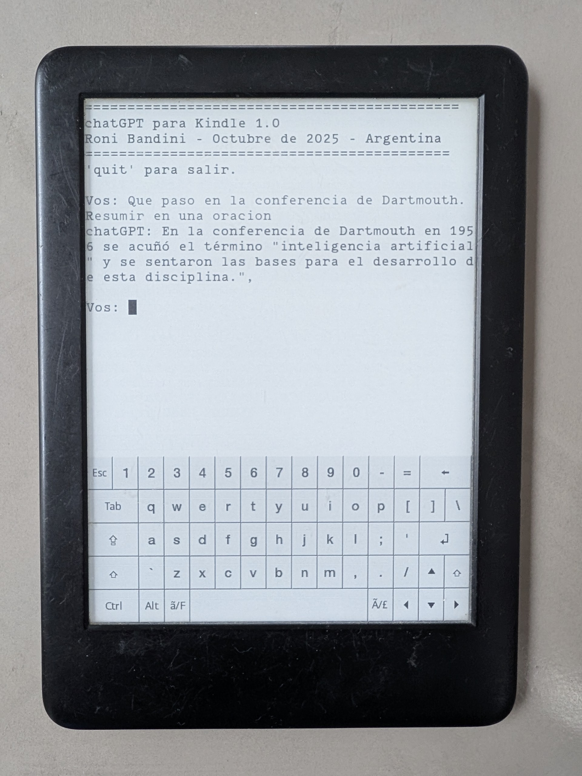 The procedure is neither simple nor quick, but the majority of the time is spent on the jailbreak process. Beyond the jailbreak, it's valid to question the utility or the point of having chatGPT on a Kindle. Perhaps there is none. Perhaps it's just about testing the OpenAI API, exploring Bourne Shell, and remembering the VI editor. Perhaps it’s a way of reclaiming sovereignty over our devices, proving that we can be something other than a compliant user.