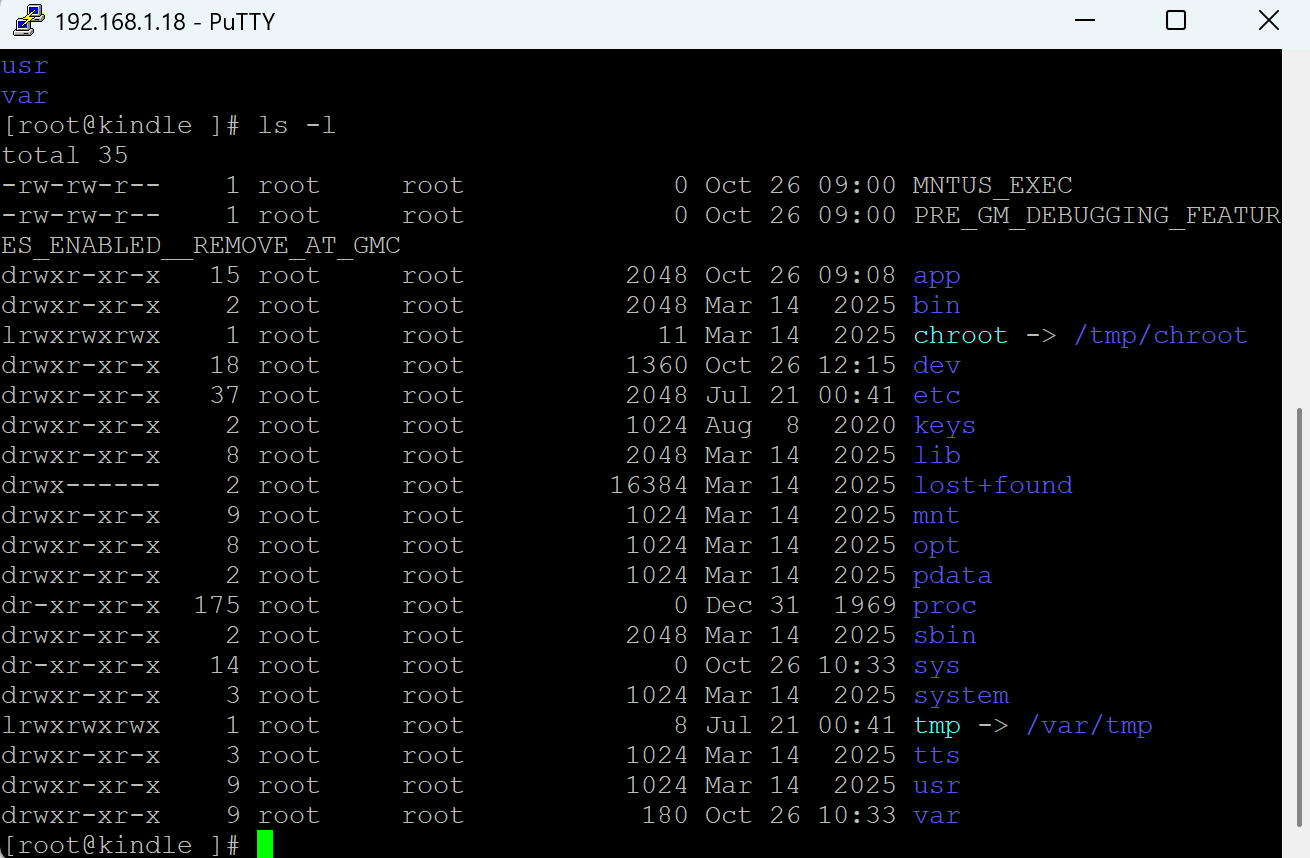 • Connect to the Kindle's IP address on port 23 using Putty or any other terminal software.