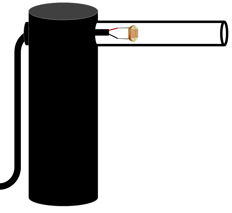 A small LDR sensor is used. Two aluminum pipes from 80mm are required. One with a 30mm outer diameter and one with a 10mm outer diameter. 3D printing would be an alternative. A 10mm hole is drilled in the top middle position of the 30mm tube. The 10mm tube is placed inside this hole.