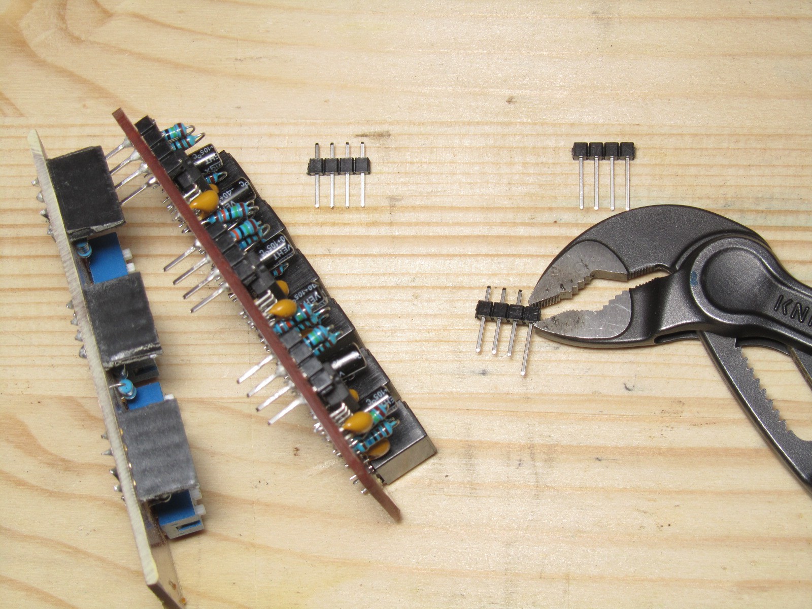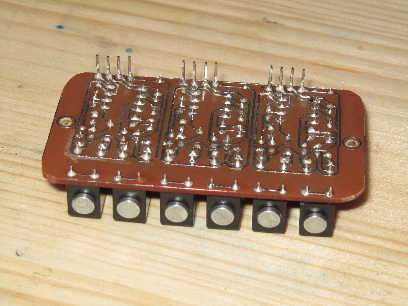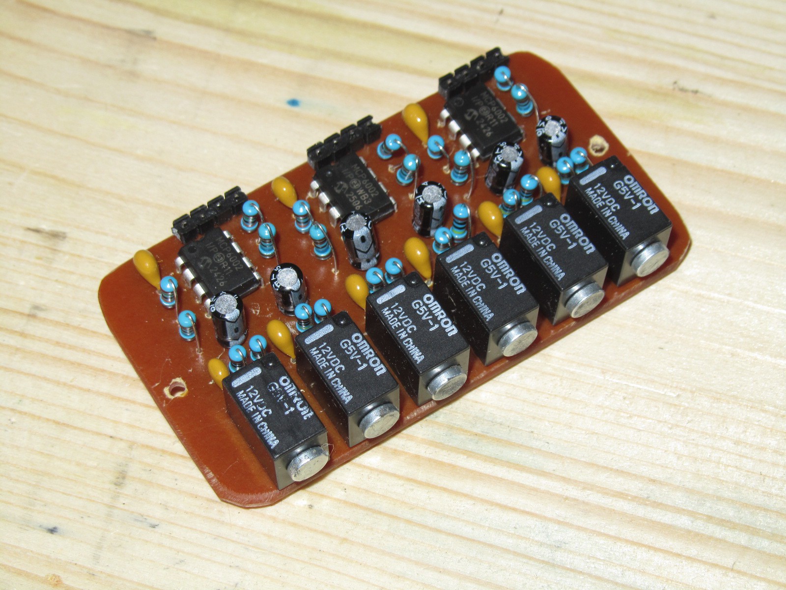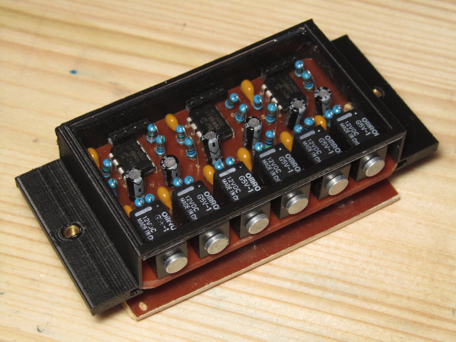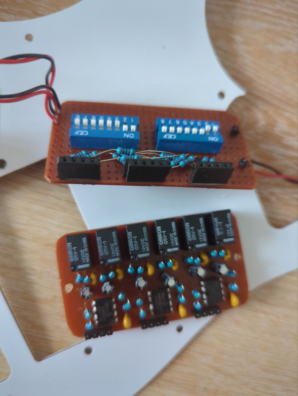 Now there are several ways to use this setup. It can be used just as a gimmick, a totally normal pickup made of unnecessarily abused components. Or it can do something, regular pickups cannot do. First of all, I've made a board that mixes 6 signals from 6 strings to two channels. It can be used as a stereo effect such that different strings sound like they're coming from different "directions", or it can be used to apply different effects to different strings, as if one plays two different guitars connected to two different signal chains/amps/speakers.