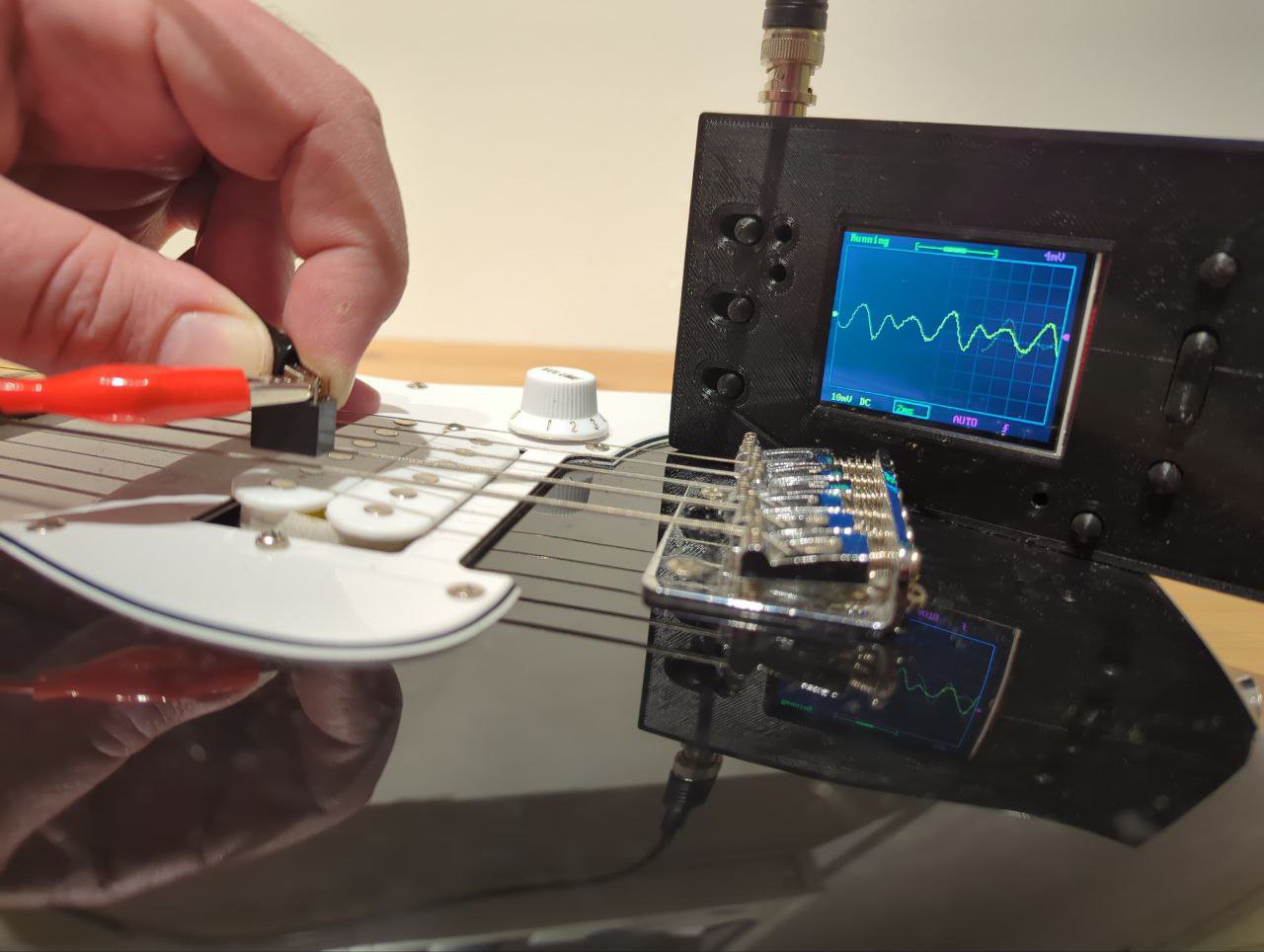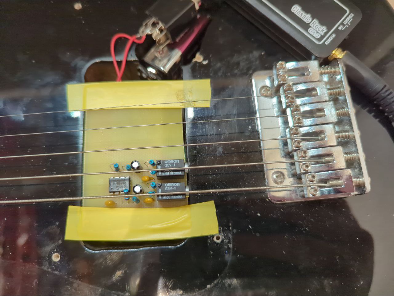 Not gonna lie, I've also seen coils taken from relays used as pickup coils on a DIY-pickup on the internet. But I didn't want to go that way, I wanted to abuse the component, not kill it and use its internals for something else. I tested if the coil of an unmodified relay can give a usable signal and it did! I learned what I needed to amplify the signal in a couple of weeks and built a fully functional hexaphonic pickup. It's surprisingly good for what it is: the coil of a relay is designed to produce magnetic field almost exclusively within the magnetic circuit it's wound around, leaving just a small gap for the contact motion, but that gap is enough for the magnetic field of the string to get inside of this circuit.